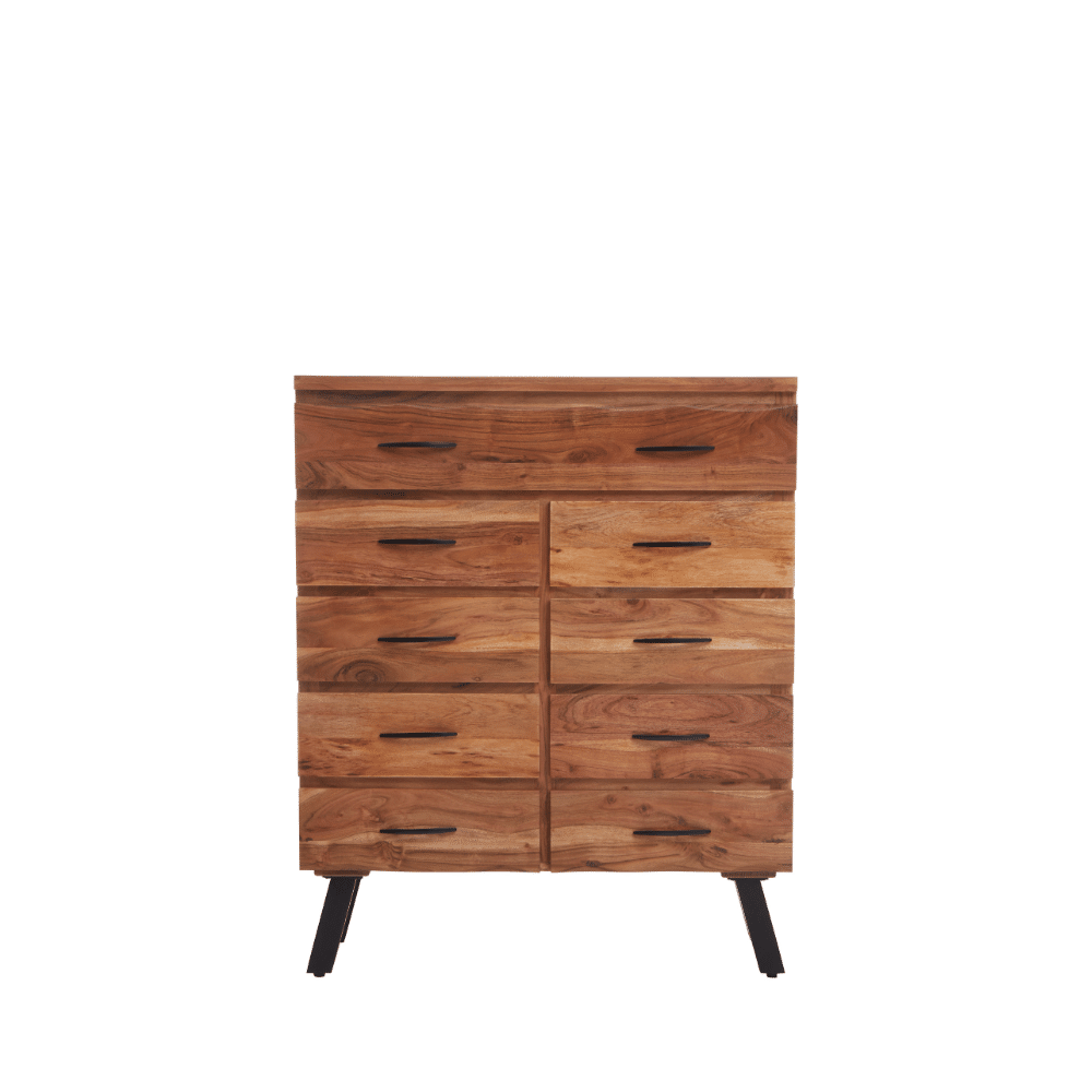 Introducing the Acacia Frame Drawer Tower, a modern chest of nine drawers that highlights the warmth and texture of acacia wood. Clean lines and industrial black iron legs and hardware create a comfortable blend of natural and contemporary style with generous storage space.