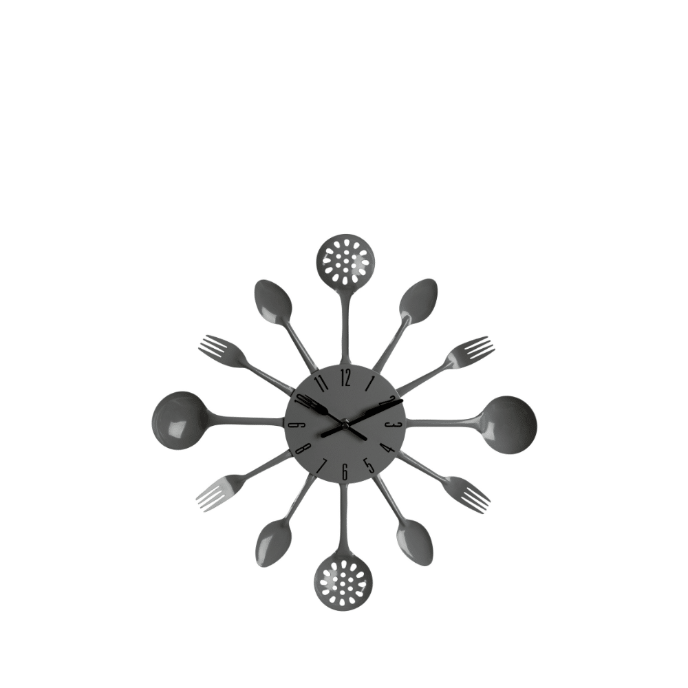 Add a playful touch to your kitchen with this grey wall clock, featuring spoons, forks, and a slotted spoon as hour markers.