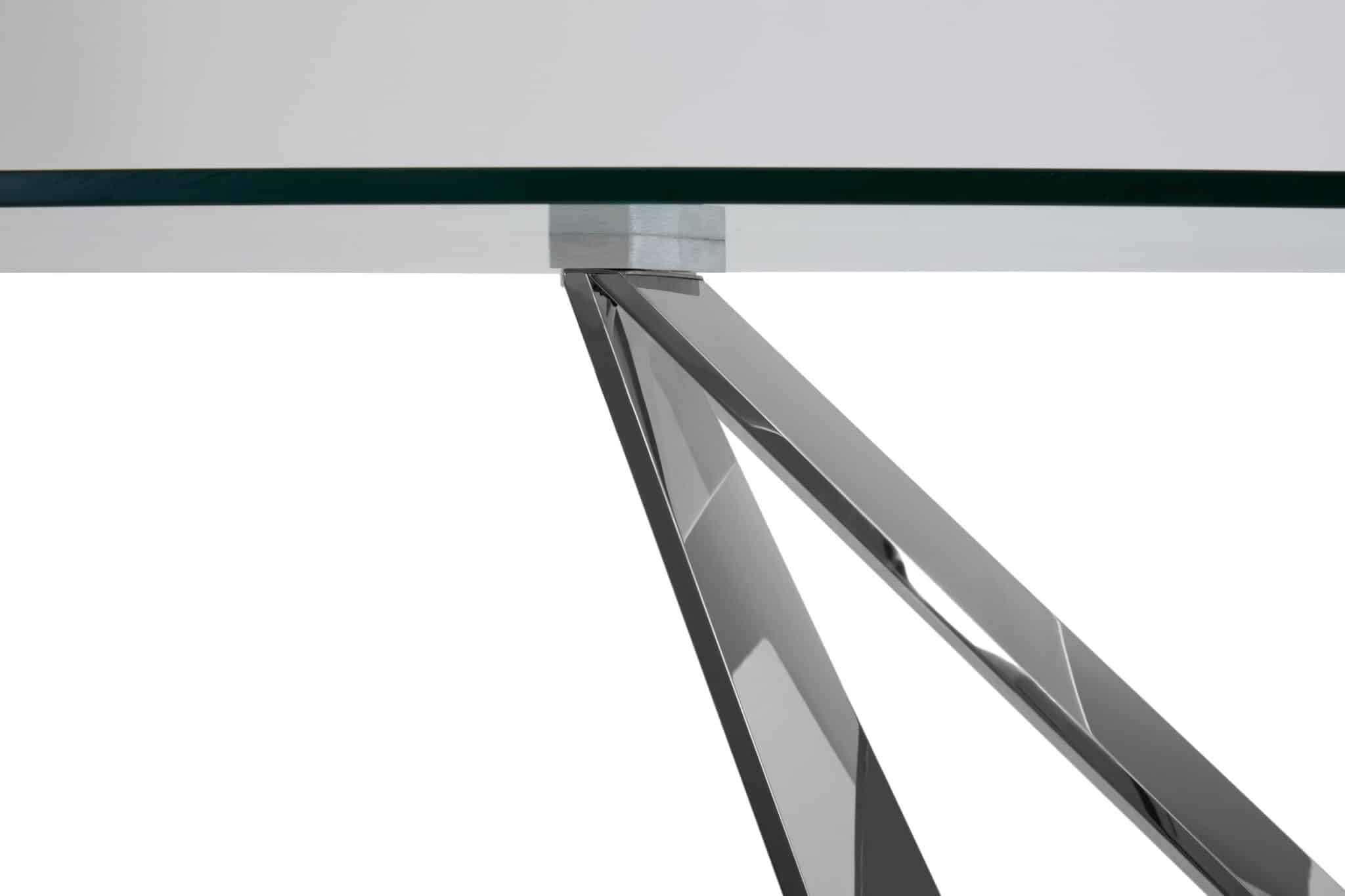 The Amanda Vertex Clear Span dining table offers a striking and modern design. Its clear tempered glass top creates an open and airy feel, while the bold angular base of stainless steel provides sturdy support and ample legroom, ensuring a comfortable and unconfined dining experience. This piece adds a touch of architectural elegance to any dining space.