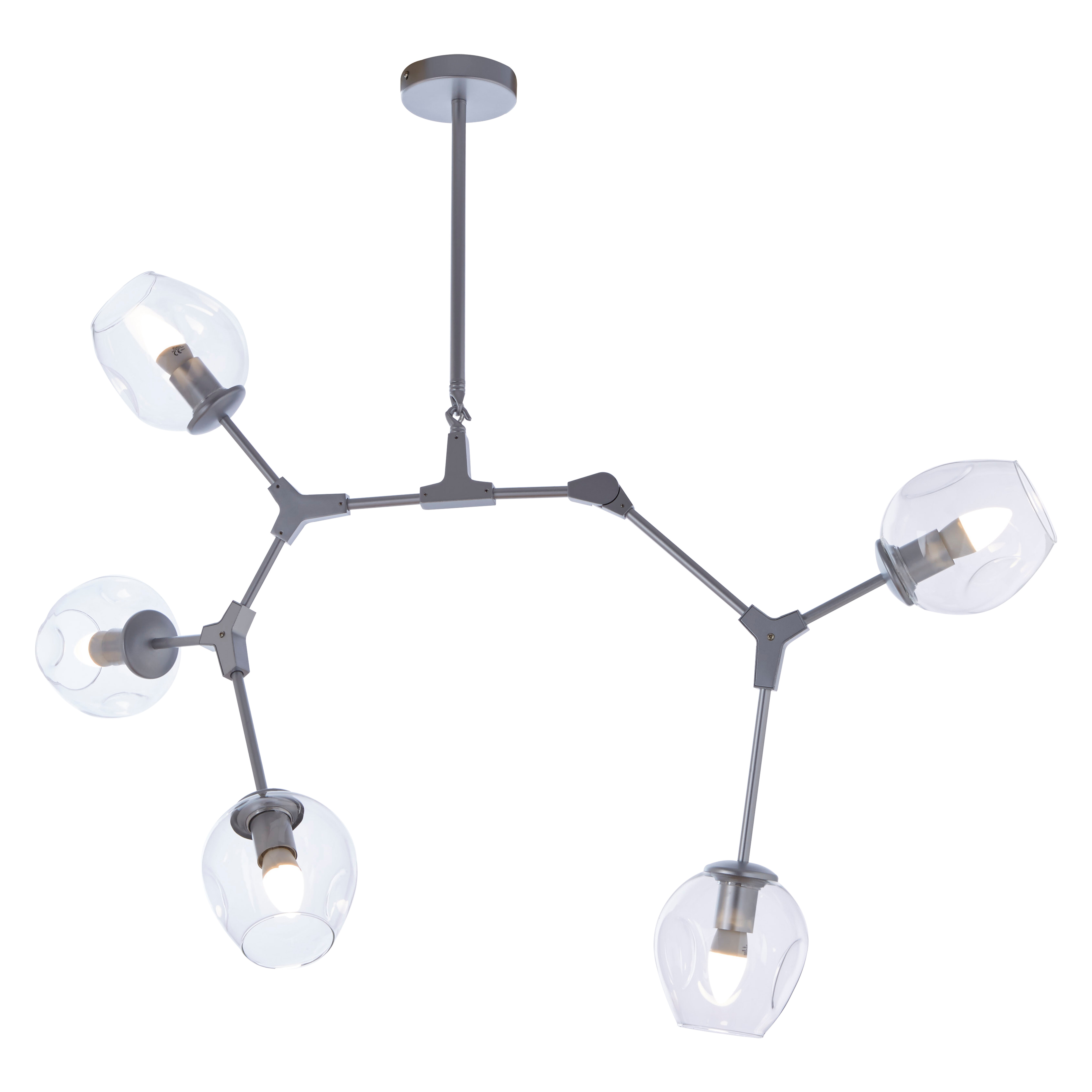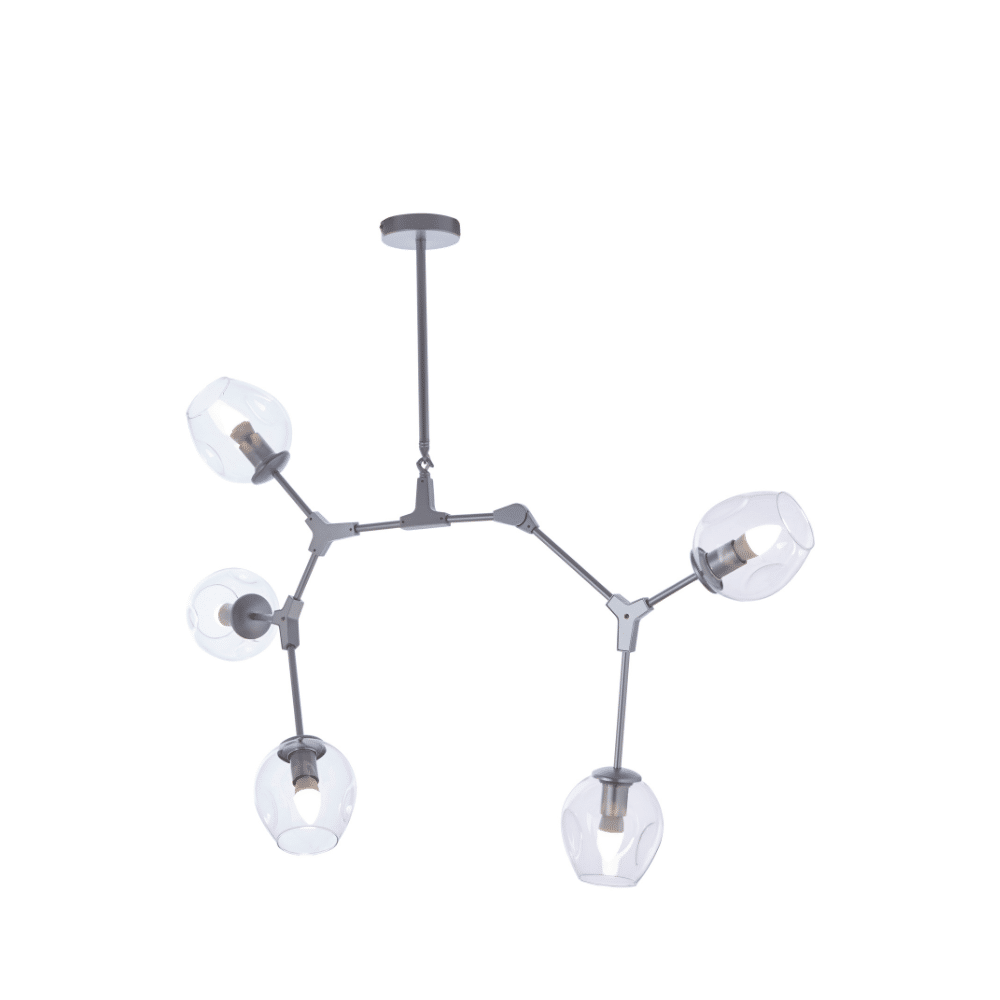 Bring a celestial glow into your modern home with our ‘Astro Bloom Pendant.’ This striking 5-light fixture features a captivating, star-like structure with sleek silver-finished arms radiating outwards. Each arm culminates in a clear, luminous glass globe, designed to cast a wide and inviting light, creating an ethereal ‘bloom’ effect. Perfect for contemporary living rooms, minimalist dining areas, or grand entryways, this pendant light is a true statement piece that blends modern design with celestial inspiration, adding visual interest and sophisticated brilliance to any space.