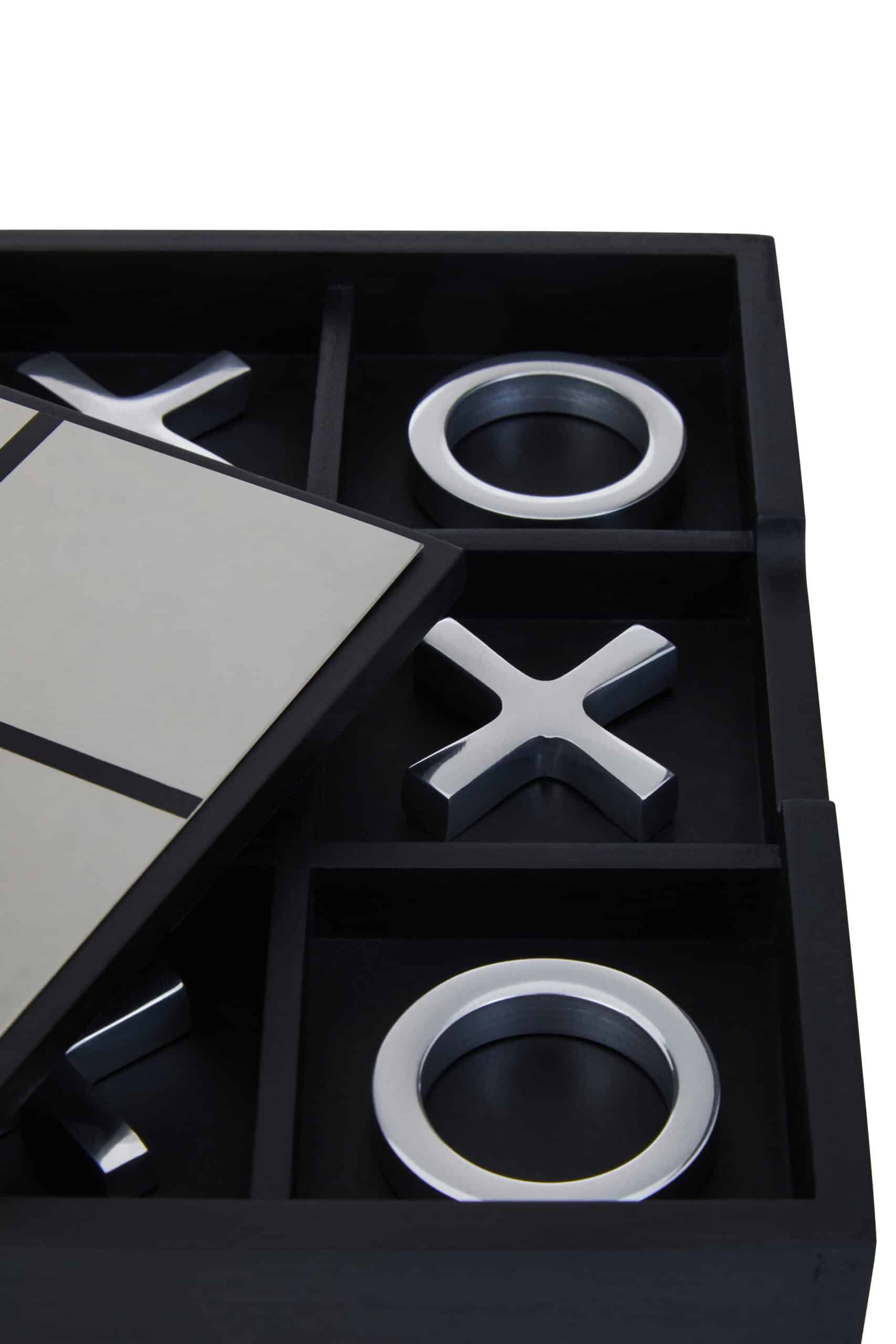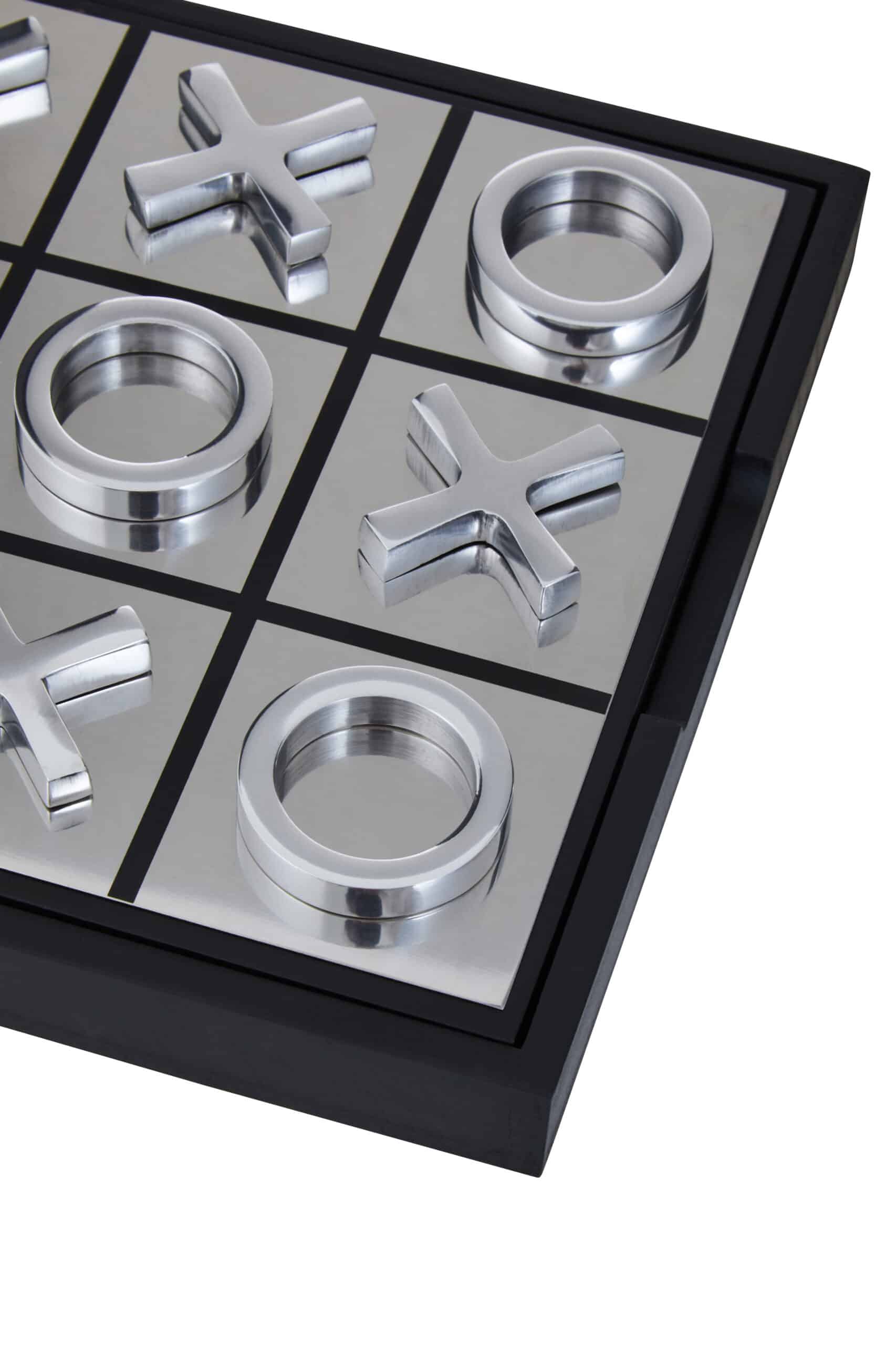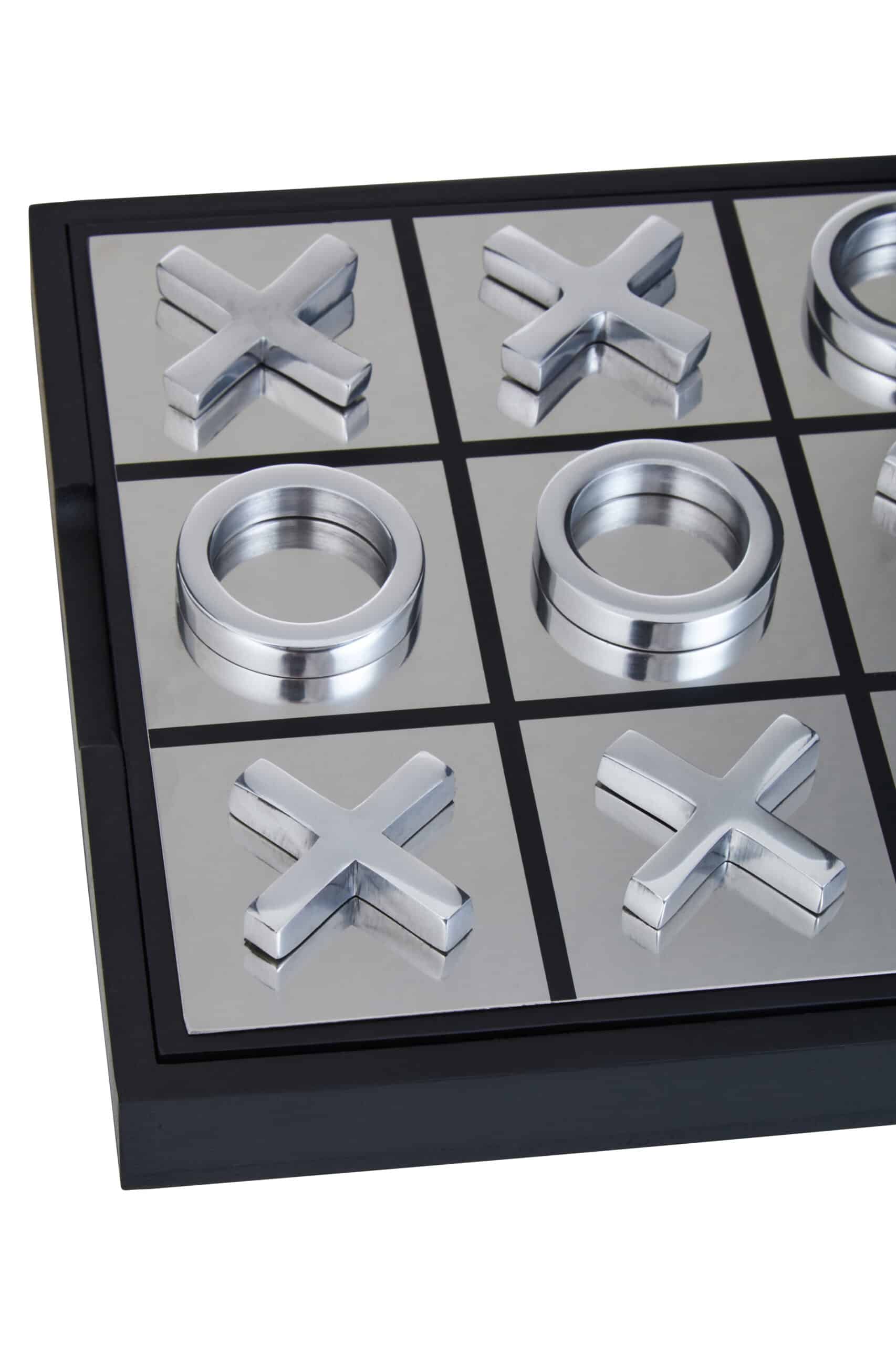 This Black & Silver Tic-Tac-Toe features sleek silver ‘X’ and ‘O’ pieces on a stylish black sheesham wood and silver finish aluminum board, a luxe and functional accent.