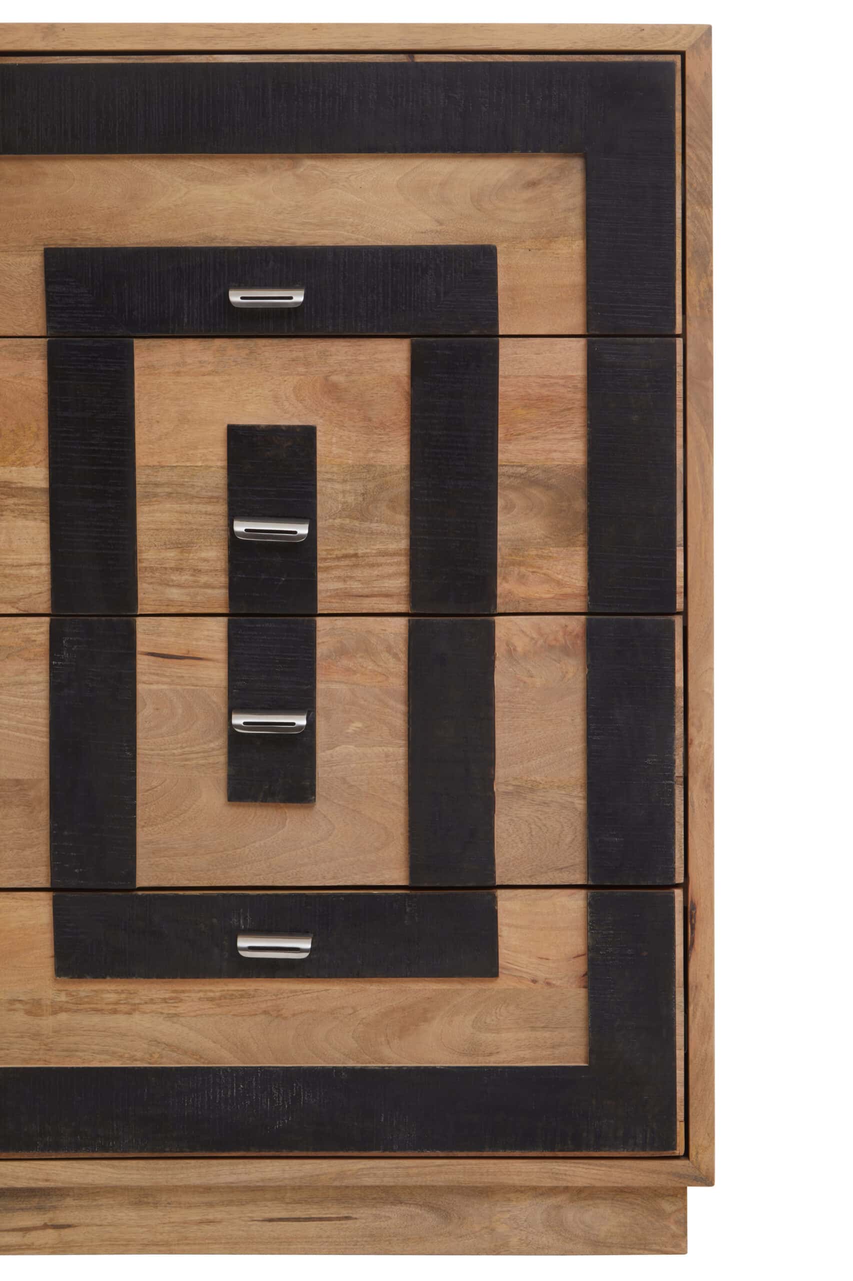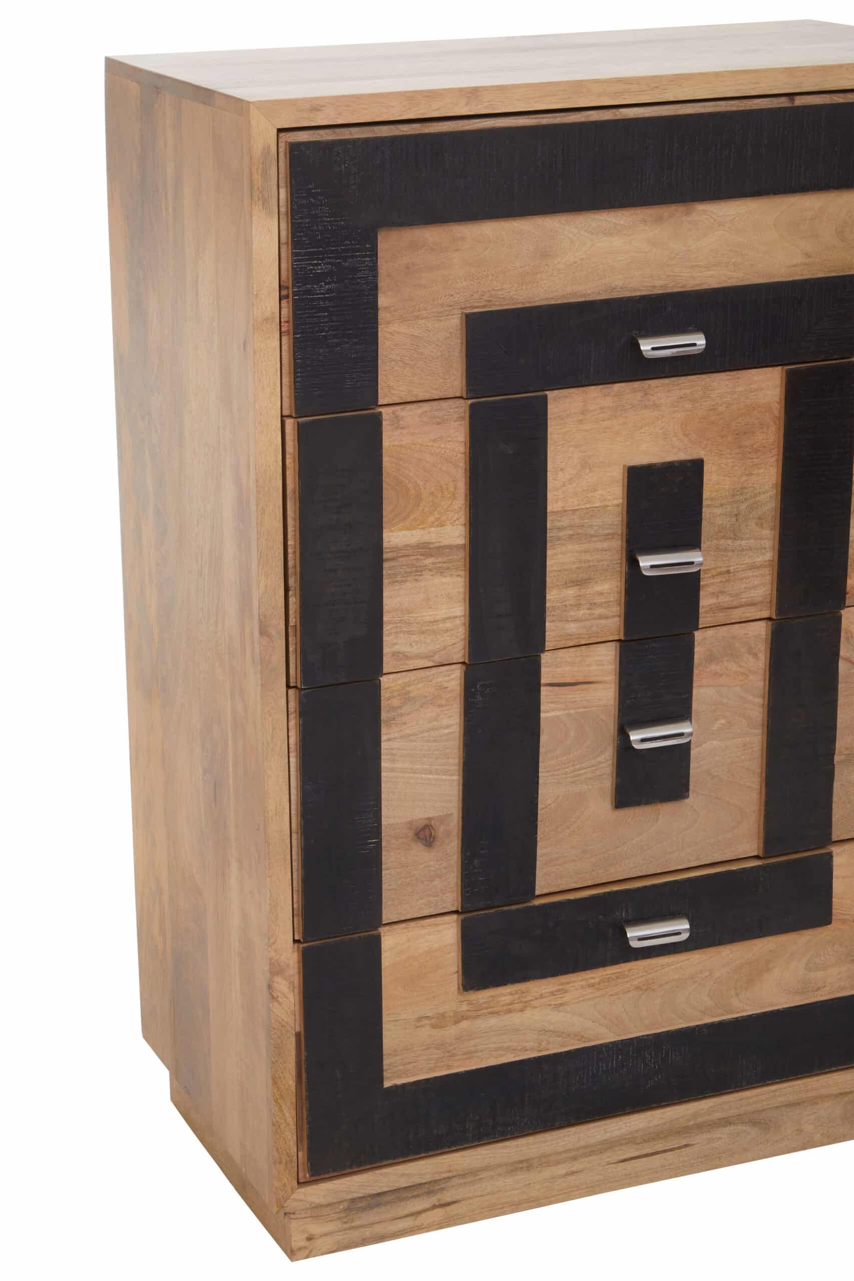 Introducing the BlockInlay Mango Chest, a modern four-drawer unit that celebrates the beauty of mango wood. The drawers are adorned with a bold geometric pattern created by alternating black and natural mango wood squares, offering a visually textured and comfortable aesthetic with ample storage capacity.