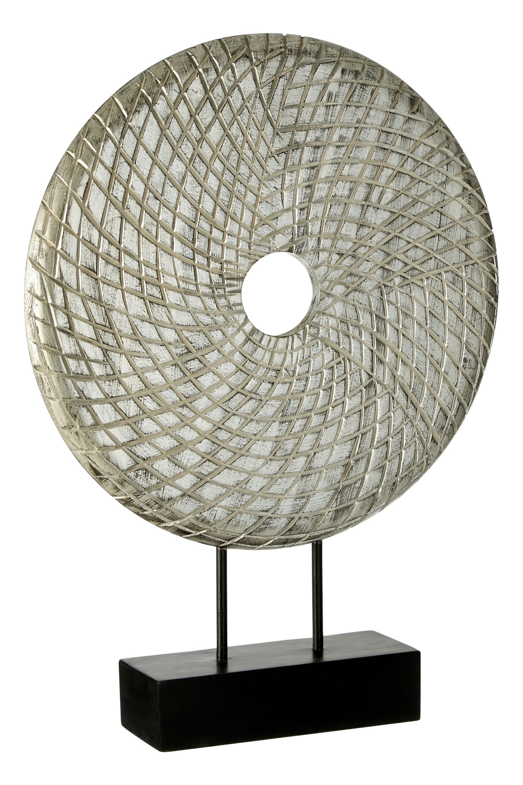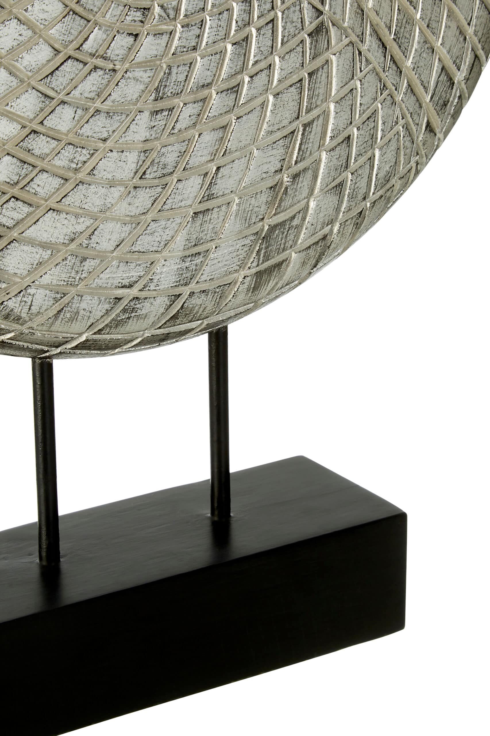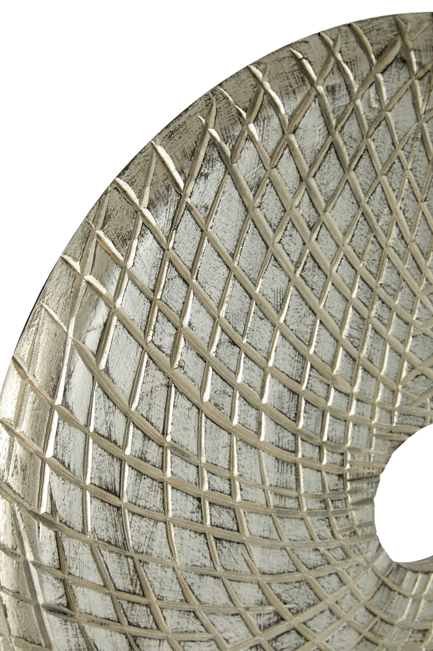 This Celestial Weave Round Sculpture, crafted from renewable mango wood, features an intricate flared grid pattern finished in a subtle silver hue. Mounted on a sleek black stand, it creates a striking contrast between natural texture and modern design, making it a sophisticated addition to any space.