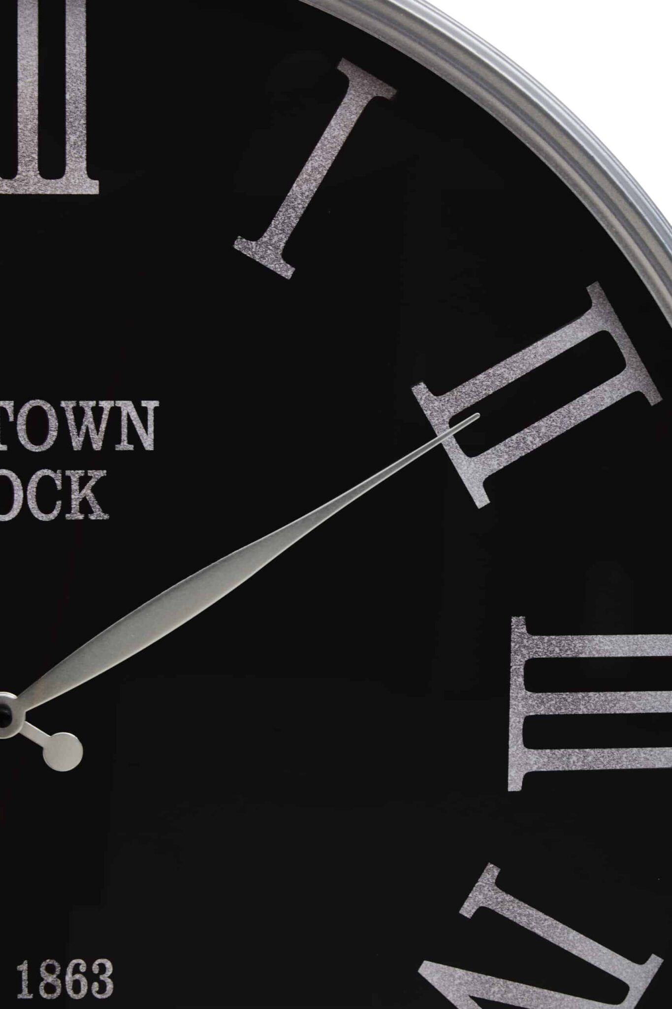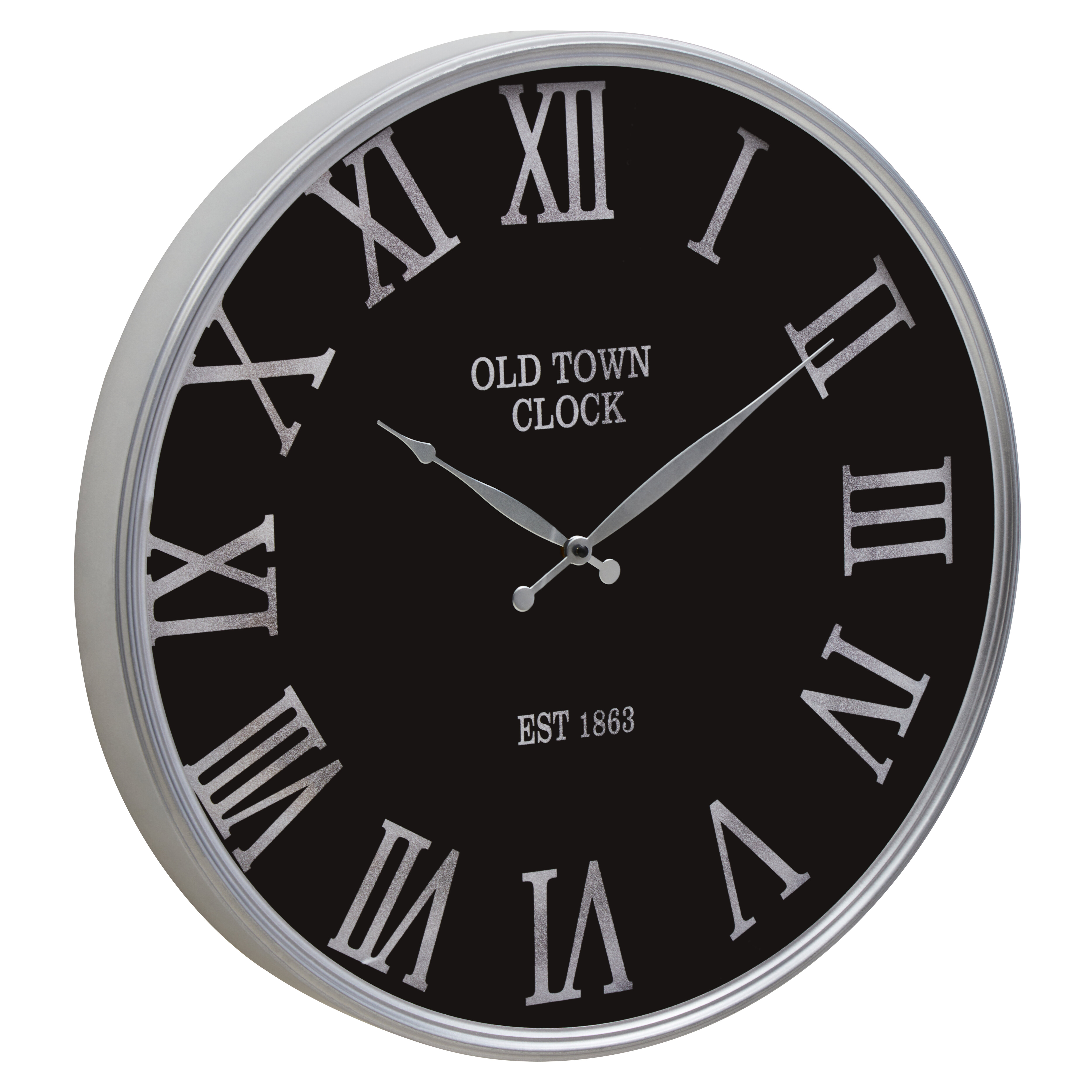 The Classic Black Face Silver Rim Clock features bold Roman numerals and a sleek silver frame for a timeless, luxurious look.