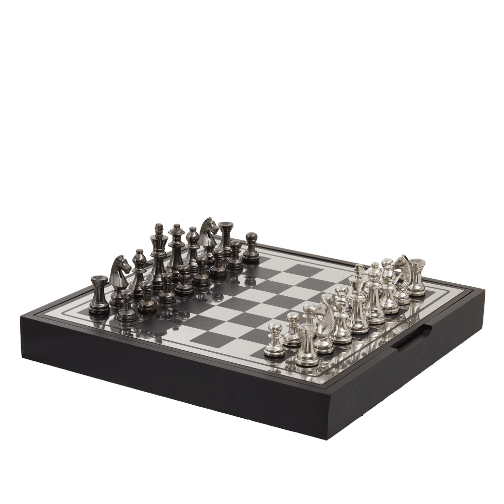 Enjoy timeless strategy with this black and silver chess set. Its metallic pieces bring a natural and sophisticated feel to this vintage-inspired game.