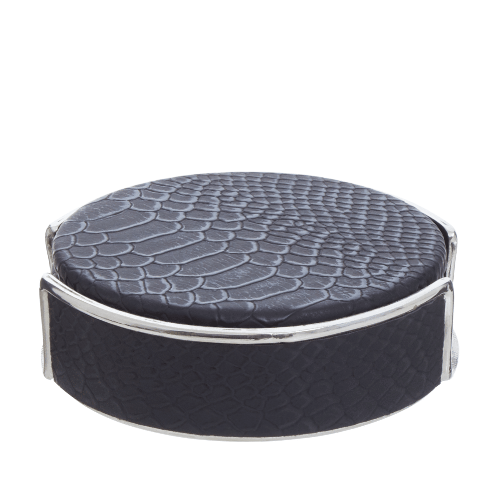 This Elegant Black Embossed Coaster Set combines sophisticated style with practical functionality. Each round coaster features a striking black faux reptile skin texture on top, complemented by a smooth black side and polished silver-tone edging. Designed to protect your surfaces from moisture and heat, these coasters add a touch of luxury to any home bar or living space.