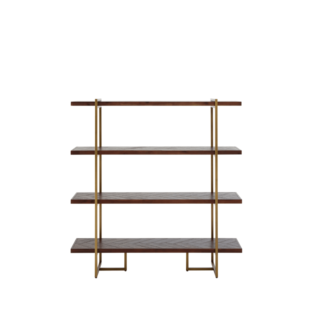 This Four-Tier Modern Bookcase with Herringbone Shelves offers a stylish and practical storage solution for your contemporary living space. It features four spacious shelves, each finished with a distinctive wood veneer in a sophisticated herringbone pattern. Supported by sleek gold-toned metal frames, this open-concept bookcase is perfect for displaying books, decor, and collectibles, adding both elegance and functionality to any room.