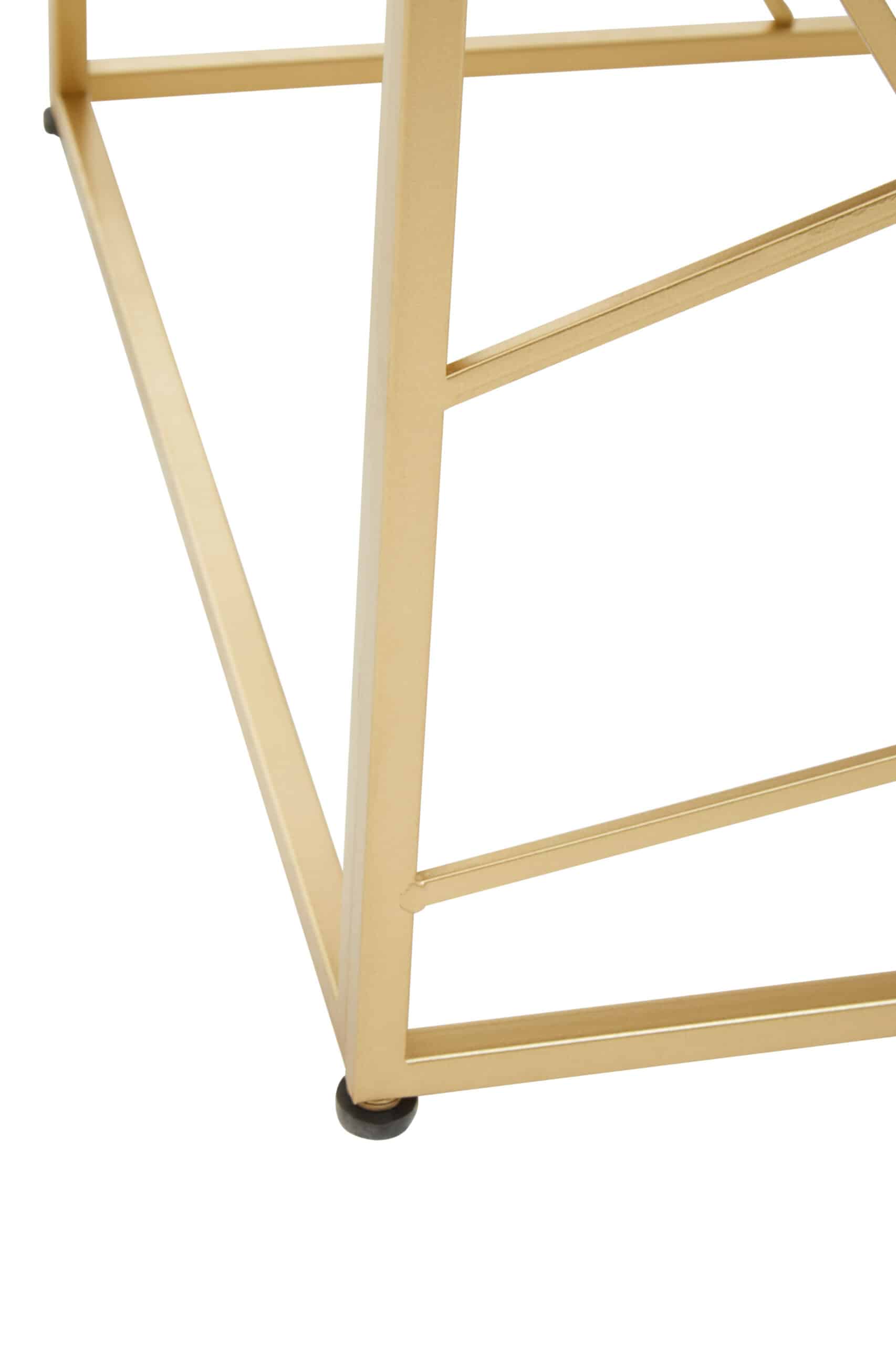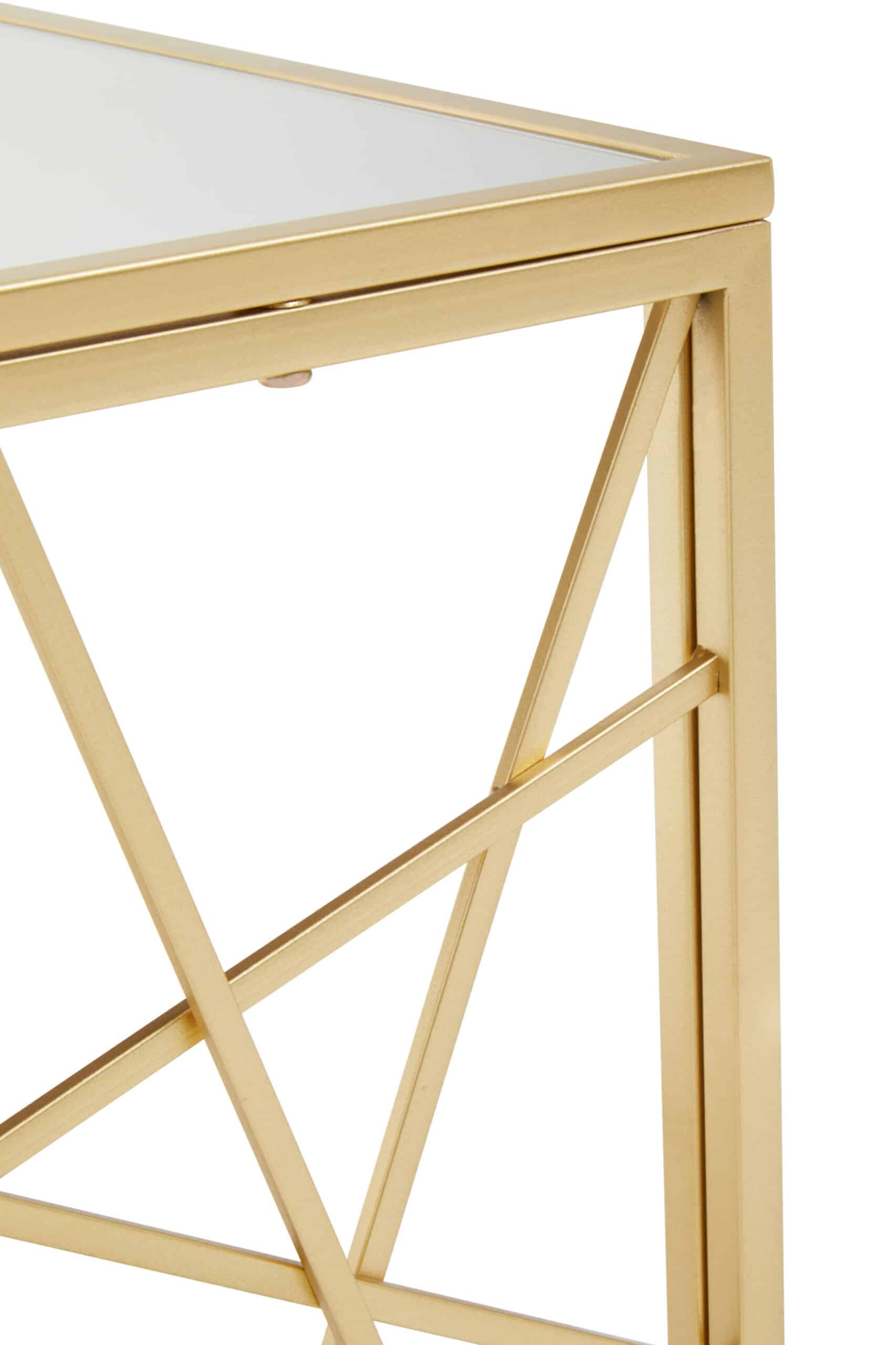 The Fractured Glimmer Stand side table offers a striking modern aesthetic. Its abstract geometric frame, crafted entirely from iron with a luxurious gold finish, creates a visually dynamic presence. Topped with a sleek mirror surface, this piece adds a touch of reflective elegance to any contemporary living space.