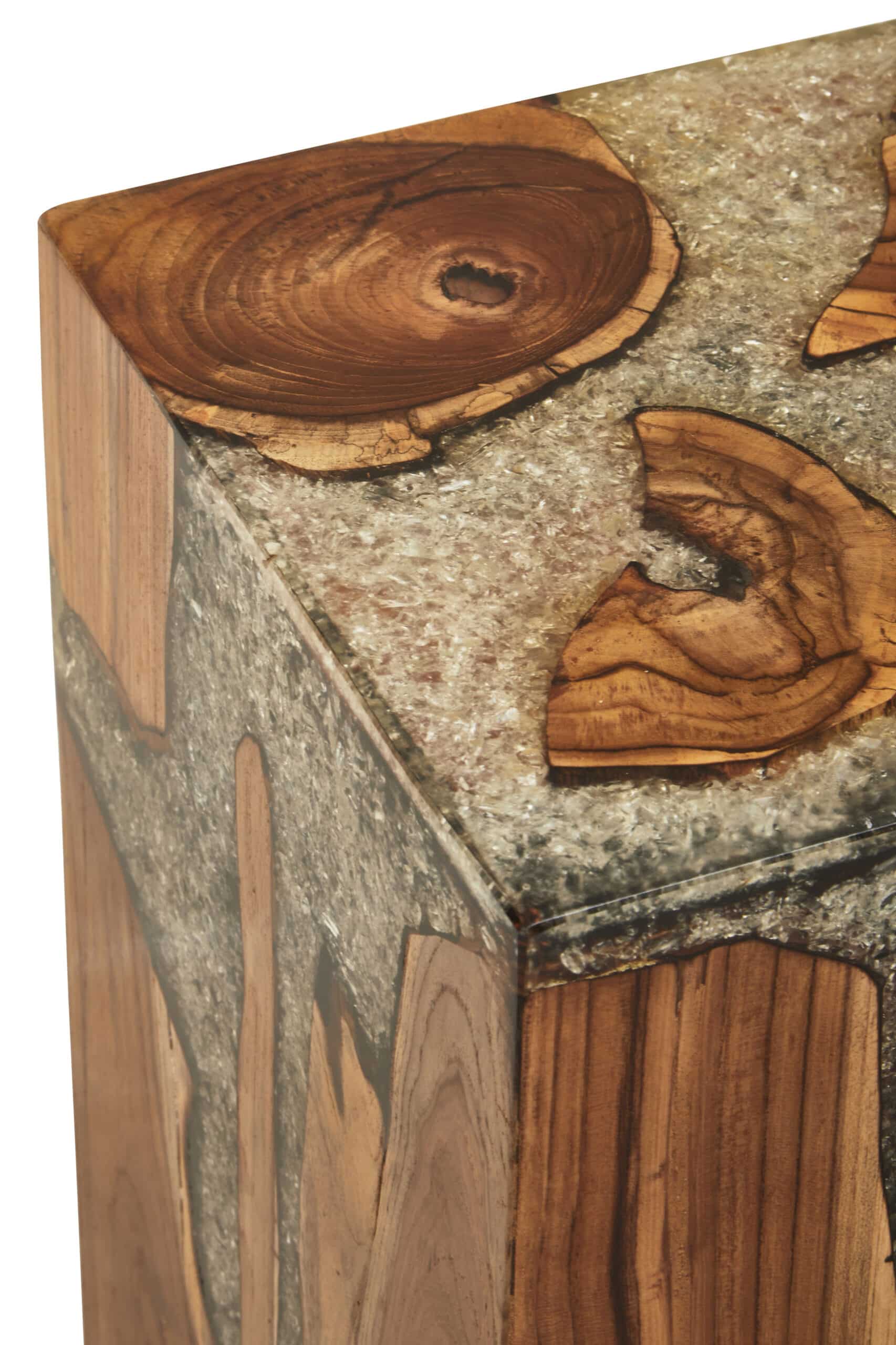 The Fragment Ascent Stool features a unique sculptural design with a stable top. Crafted from sturdy plywood and solid teak wood, it’s accented with broken tempered glass inlays set in smooth resin, making it a striking accent or occasional seat.