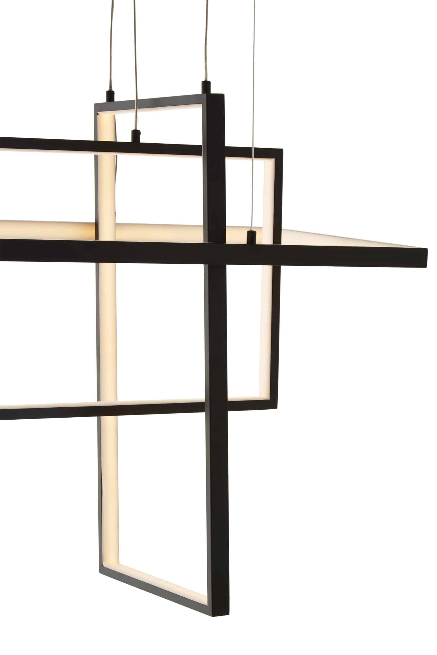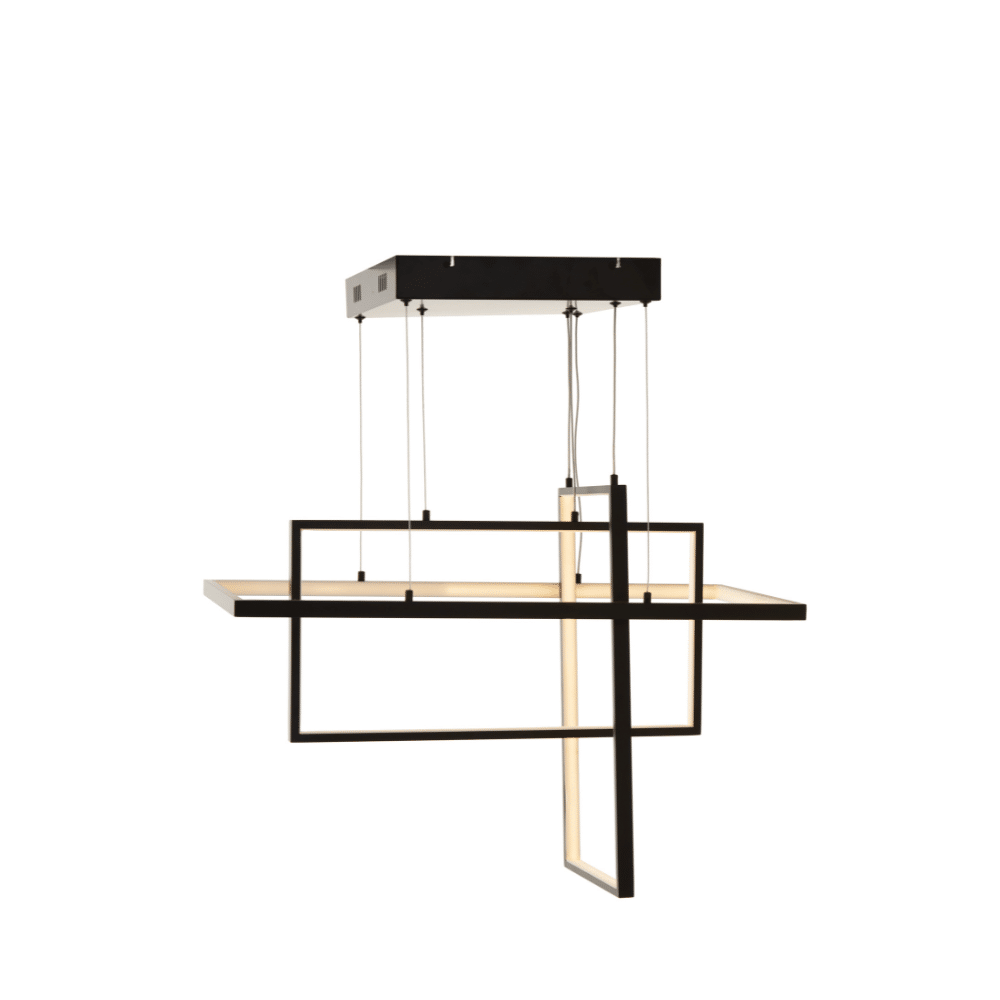 Introduce striking modern artistry into your home with the ‘Geo Frame Pendant Light.’ This captivating light fixture features an abstract geometric profile, with sleek rectangular frames that seemingly float and overlap. Crafted from a durable blend of aluminium, iron, and PVC, its minimalist black finish exudes contemporary elegance. The integrated linear lighting within the frame creates a sophisticated glow, making it an ideal statement piece that blends effortlessly into stately decors, from grand living rooms to chic dining areas.