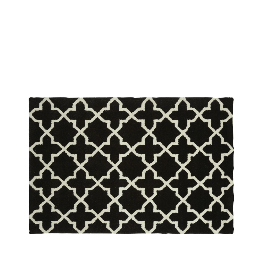 The Geometric Monochrome Area Rug is a stylish addition to any room, offering a dynamic abstract design in classic black and white. This rectangular rug features a captivating interplay of checkerboard and striped patterns, handcrafted to enhance contrast and visual appeal.