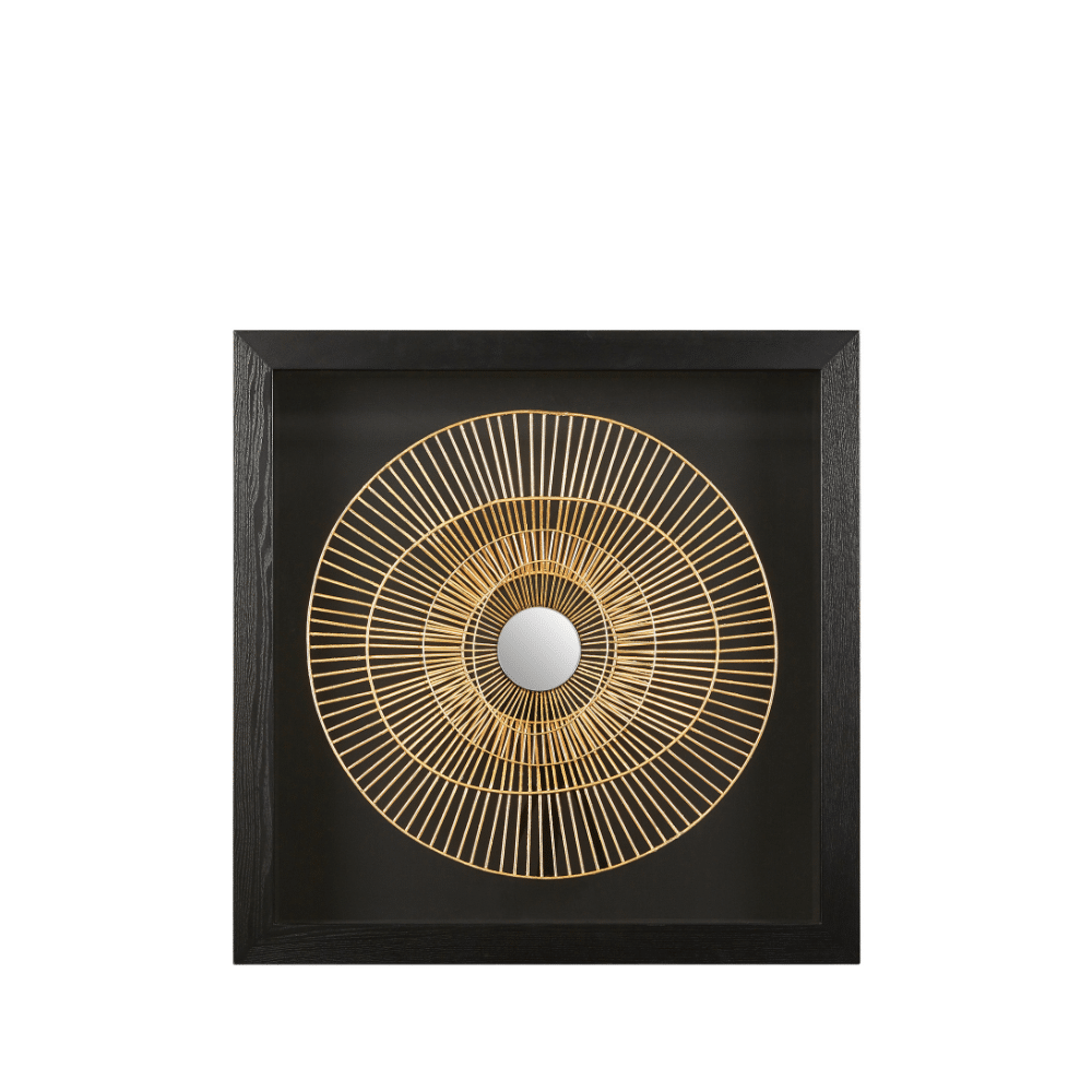 Encased in a sharp black wooden frame, this Gilded Radiance Wooden Art features a captivating gold metal form arranged in concentric circles. The interplay of the warm metallic tones against the deep black creates a modern, eye-catching focal point, adding a touch of sophisticated geometry to any space.