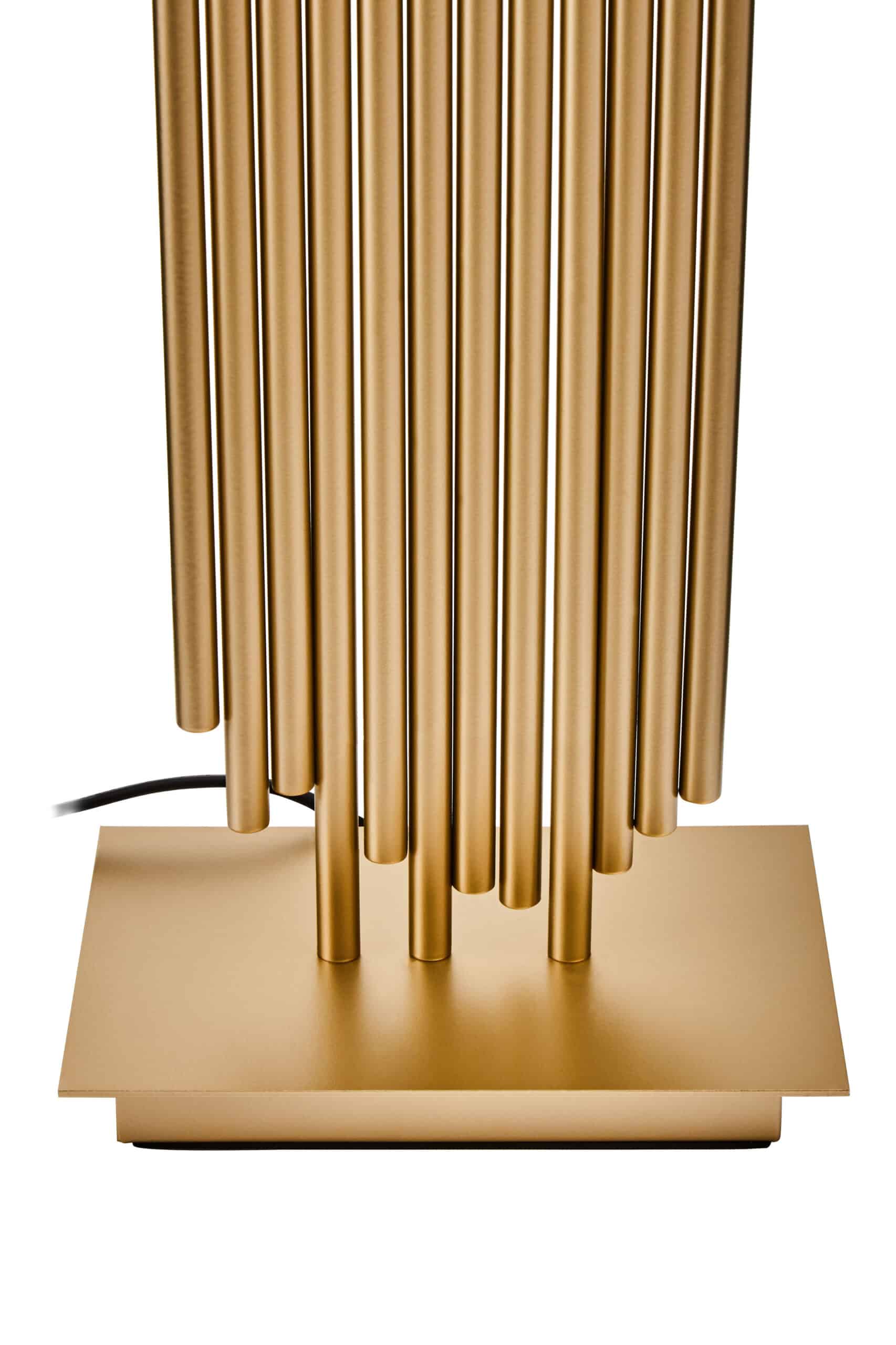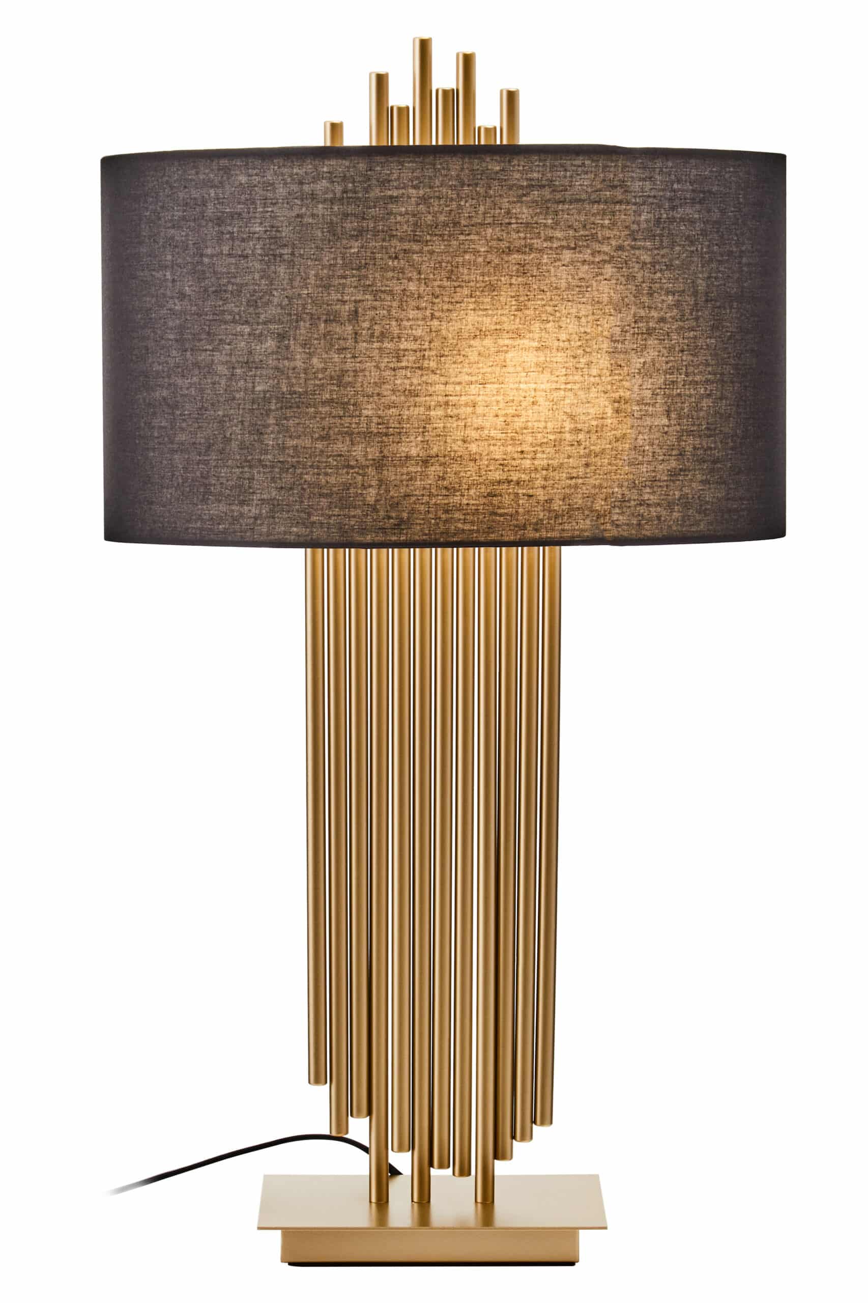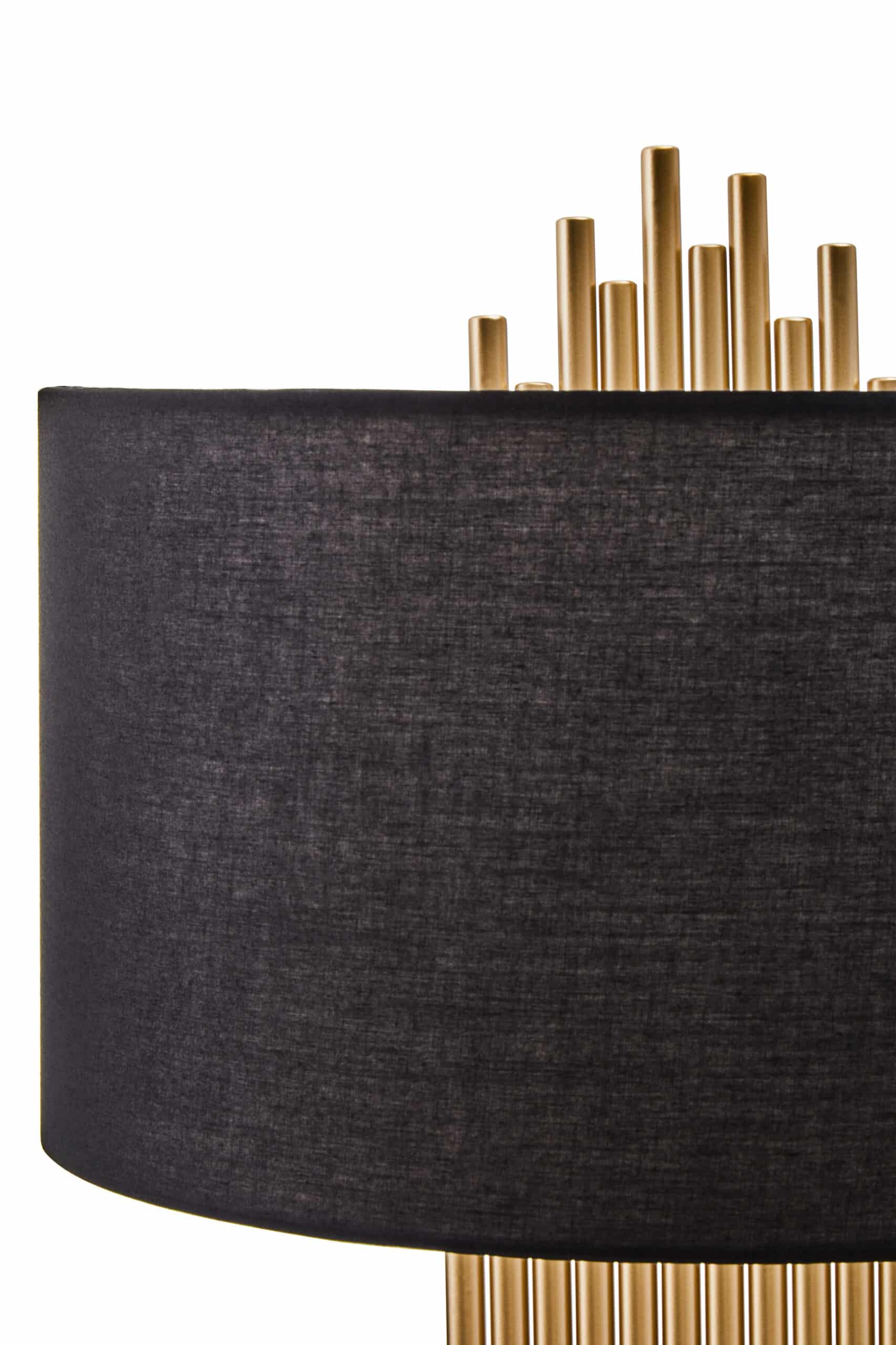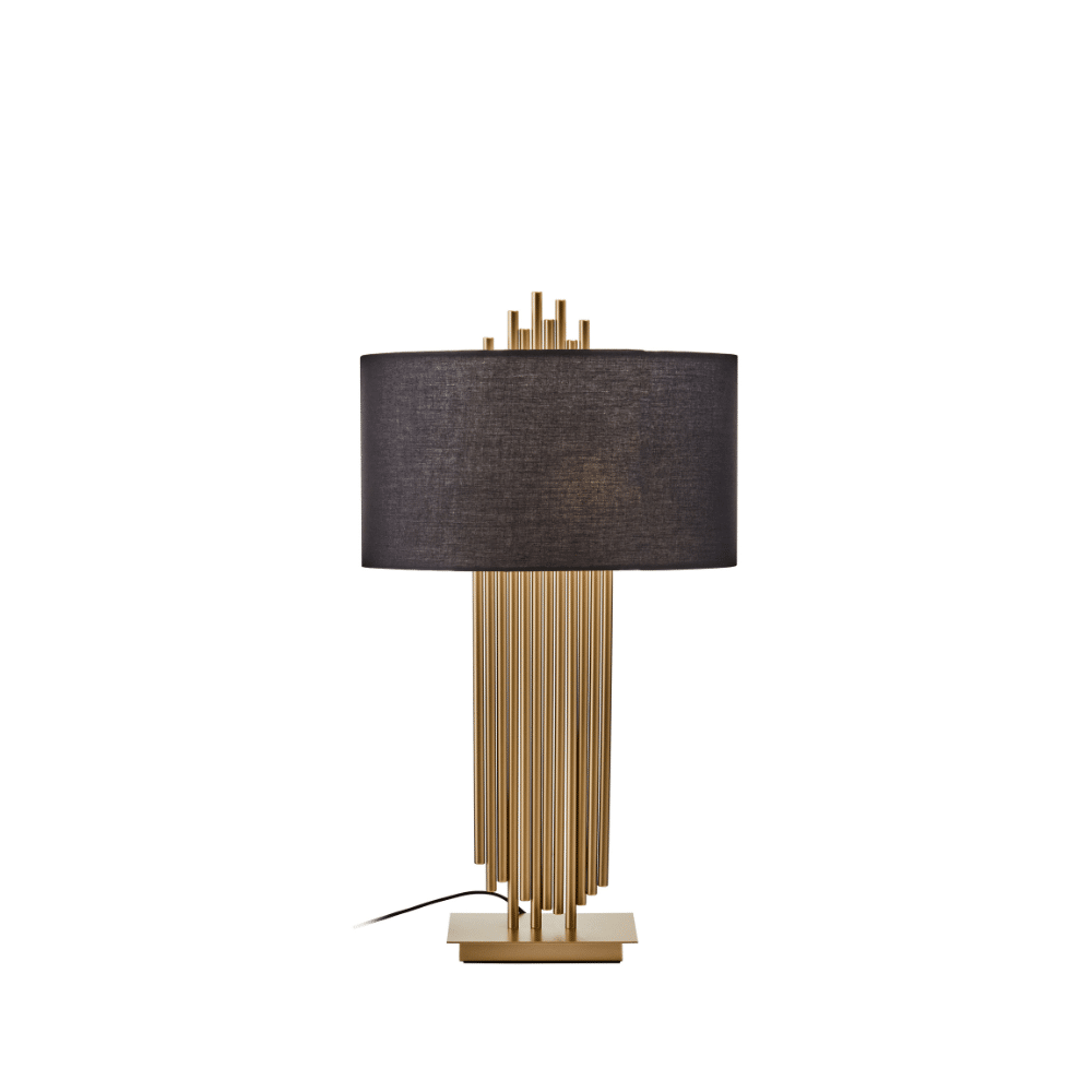 Introduce a touch of contemporary luxury with our ‘Gilded Reed Lamp.’ This exquisite table lamp features a unique base crafted from numerous gold-finished iron pipes, meticulously arranged to create a captivating panpipe-like silhouette. Crowned with a contrasting black linen drum shade, it casts a soft, inviting glow—perfect for creating an opulent ambiance. Ideal for console tables, executive desks, or as a sophisticated accent in living spaces, the ‘Gilded Reed Lamp’ is a true statement of refined taste and modern artistry.
