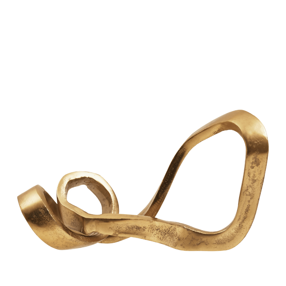 The Gilded Serenity Knot Sculpture is an unusually shaped art piece that instantly becomes an eye-catching focal point on any table or surface. This elegant sculpture is elevated with a luxurious gold accent, adding a touch of contemporary sophistication to your decor.