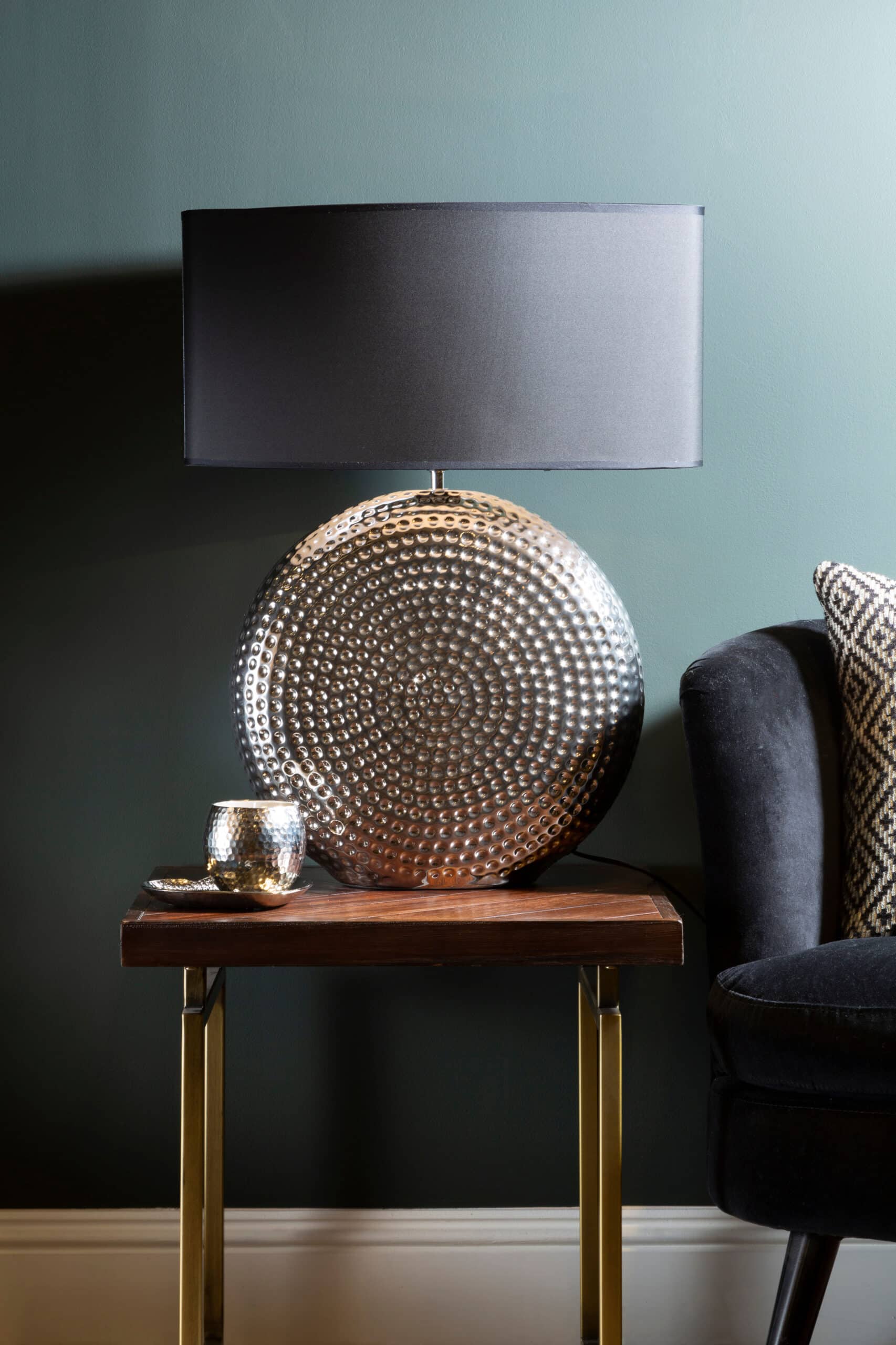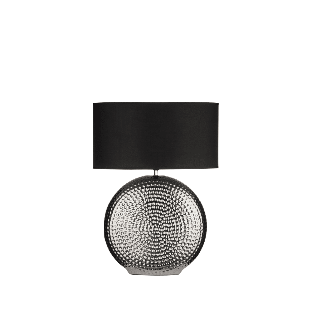 Make an immediate impression with the ‘Hammered Sphere Light.’ This commanding table lamp features a substantial, chrome-finished sphere base, meticulously crafted with an all-over hammered texture that provides visual depth and character. The crisp black drum shade offers a powerful contrast, creating a stunning monochrome aesthetic. Perfect for adding a bold yet refined touch to your decor, this lamp offers ample illumination while serving as a captivating design element. Let the ‘Hammered Sphere Light’ be the centerpiece of your modern living space.