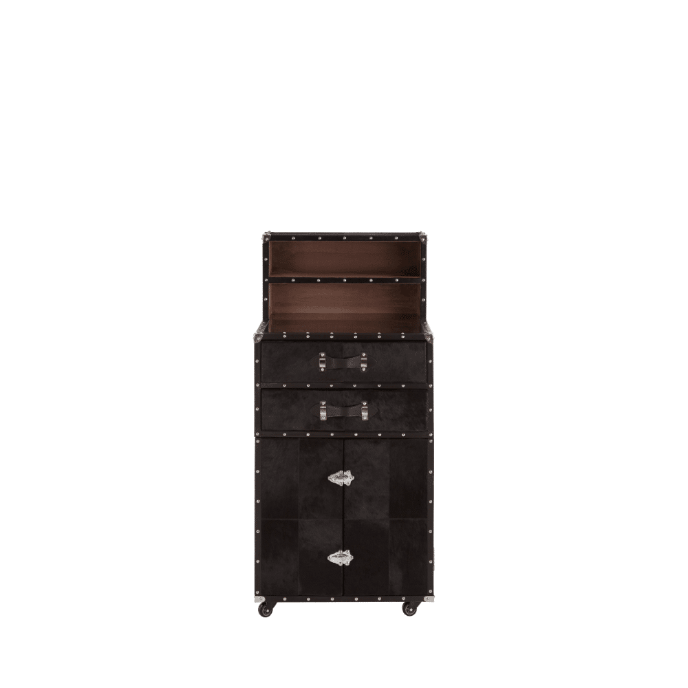 The HideBound Bar Vault offers a sophisticated and tactile storage solution for your spirits. Wrapped in rich hair-on leather, this drinks cabinet exudes a unique texture and character. Accented with metallic studs (possibly stainless steel) and featuring supple leather or suede handles, it provides a luxurious feel. Likely constructed with a sturdy MDF core, this piece brings a comfortable and stylish vintage touch to your entertaining space.