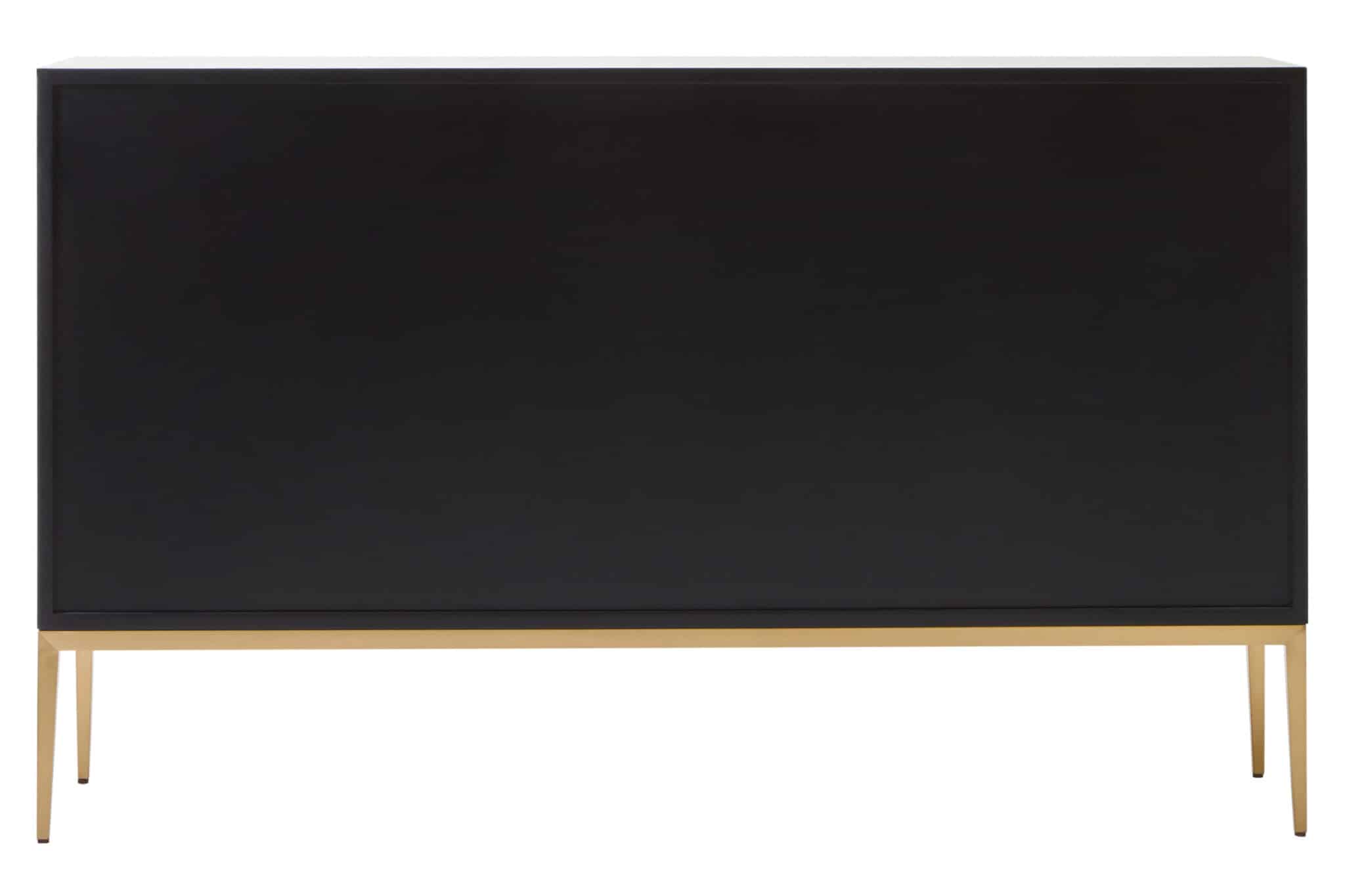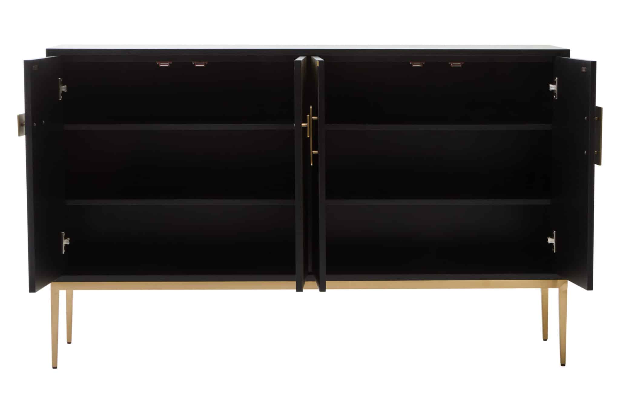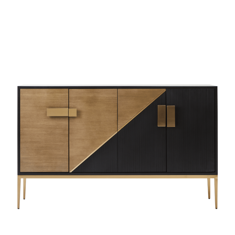 Introducing the Linear Tone Console, a modern sideboard that showcases a sleek and sophisticated design. The combination of black and grey wood (MDF and oak veneer) creates a visually appealing and versatile storage solution. Supported by elegant gold-toned iron legs, this four-door sideboard brings a sense of comfortable modernity to any room.