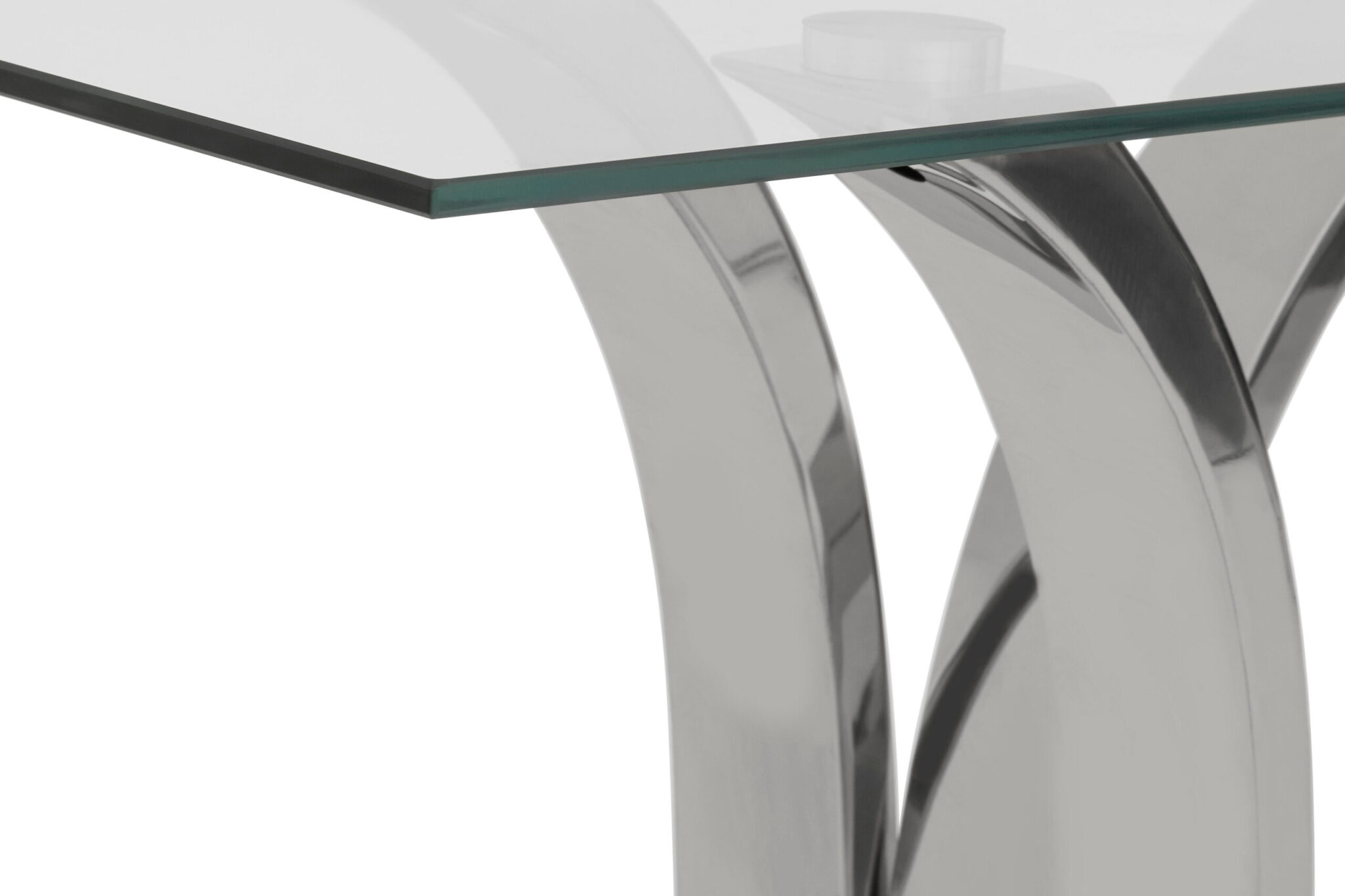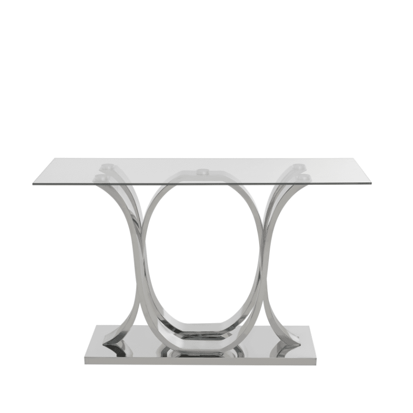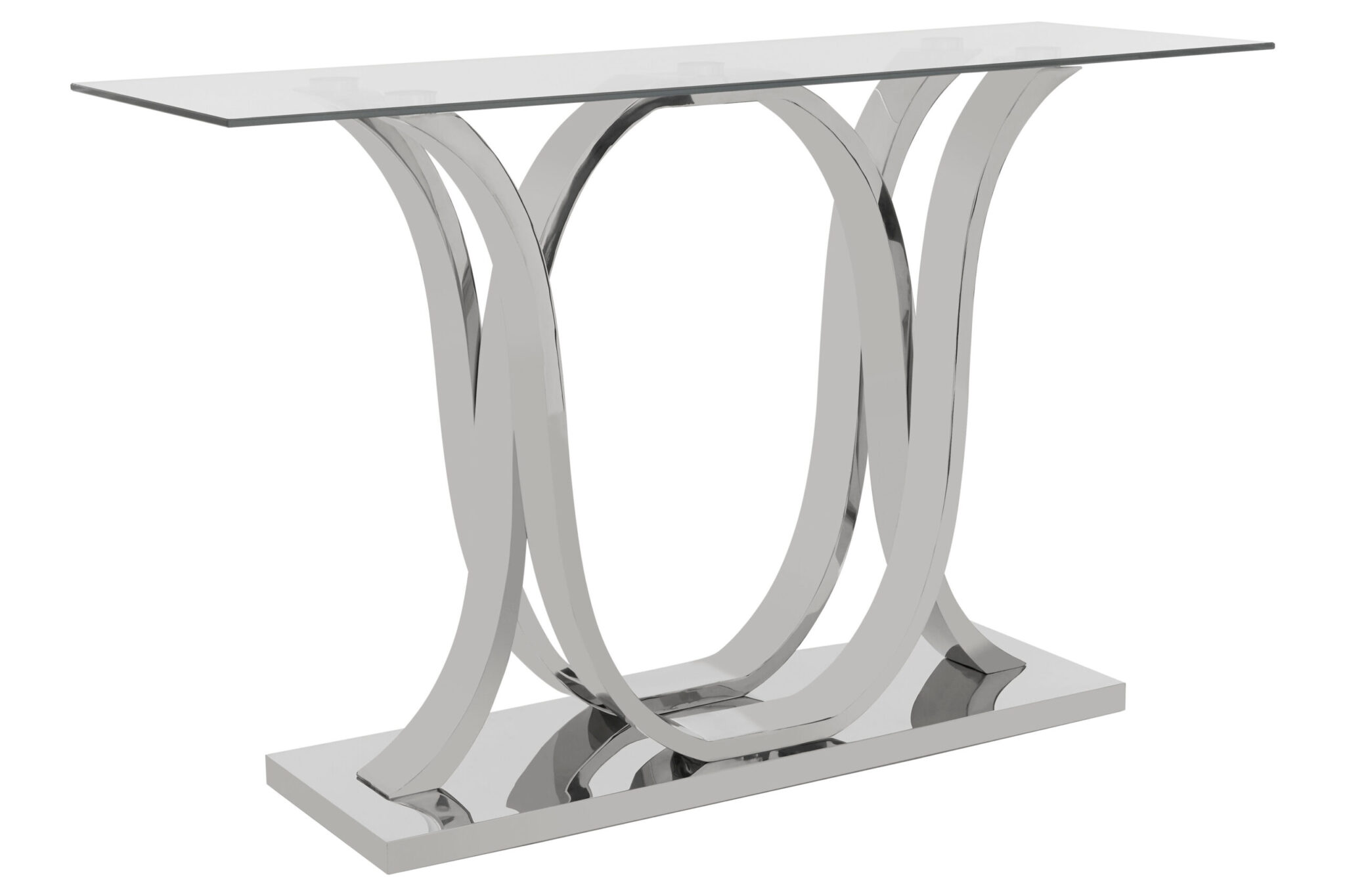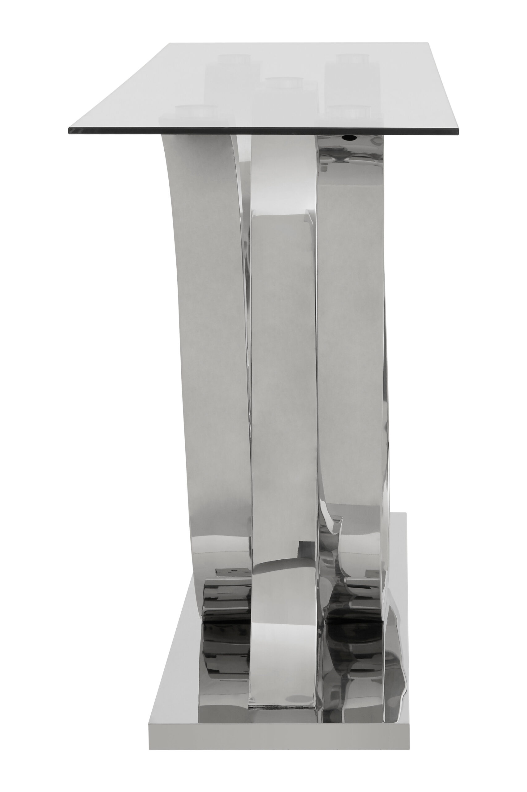 Introducing the Lucid Arc Console, a modern table that features a seamless blend of transparency and polished metal. The rectangular tempered glass top is supported by a striking base of curved stainless steel, creating an airy and sophisticated aesthetic. This console adds a touch of minimalist elegance to any interior.