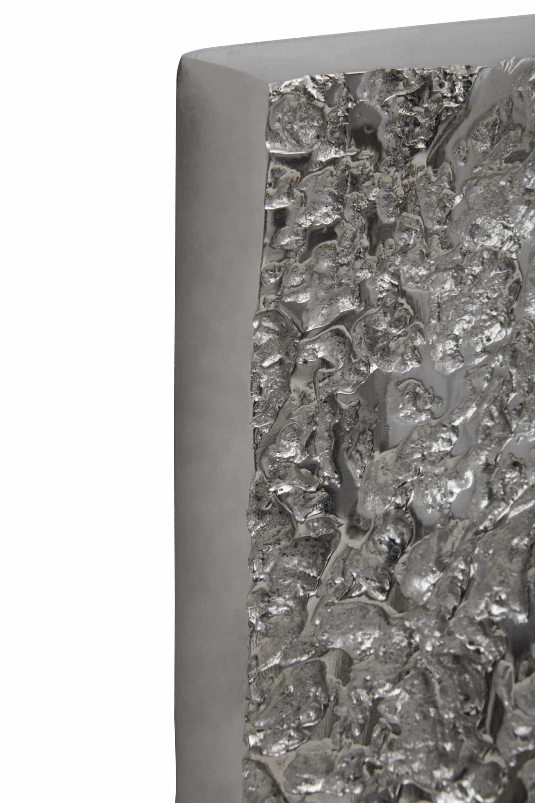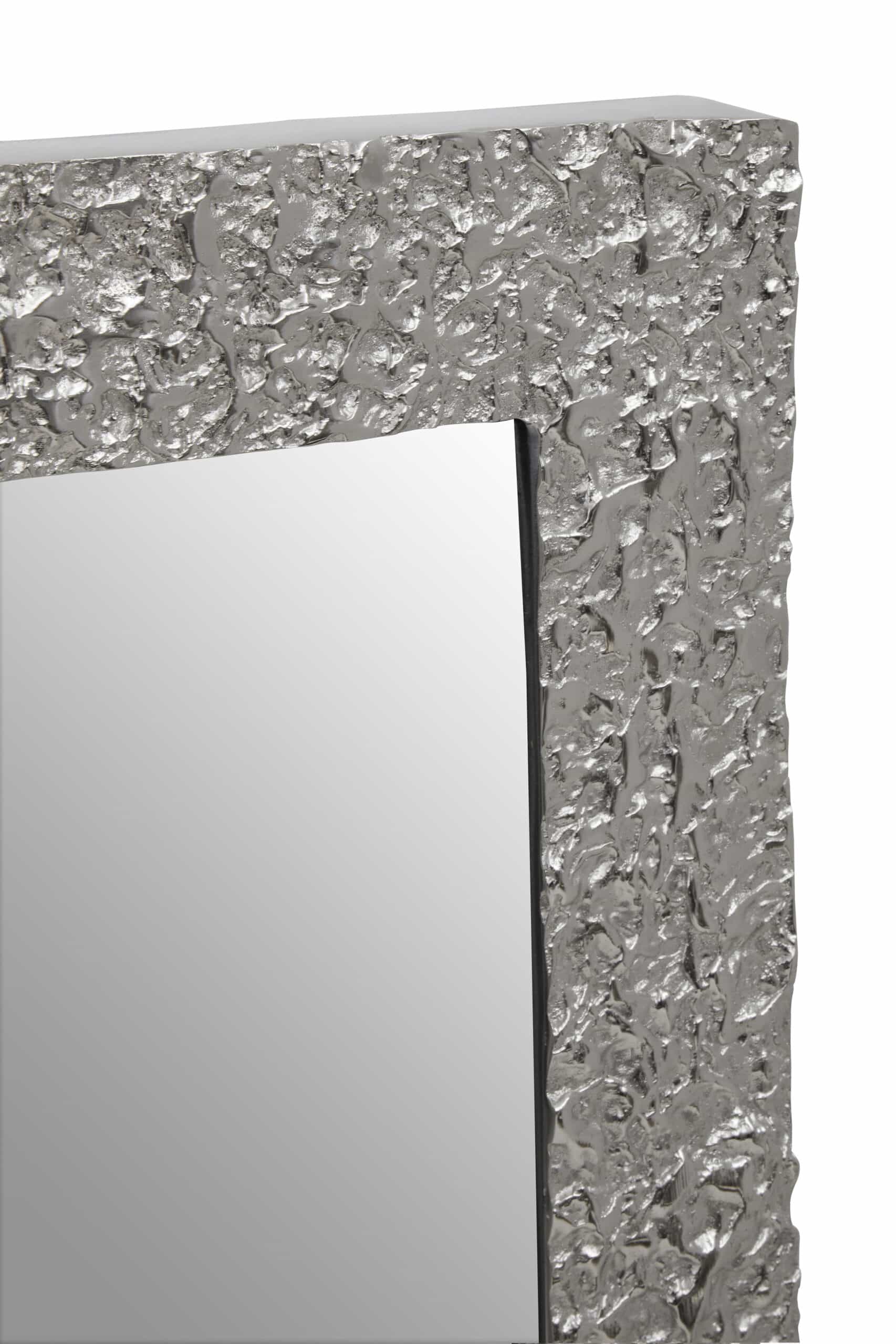 This Metallic Silver Border Mirror boasts a substantial metal frame with a beautiful silver finish, providing both a functional reflection and a chic decorative element.