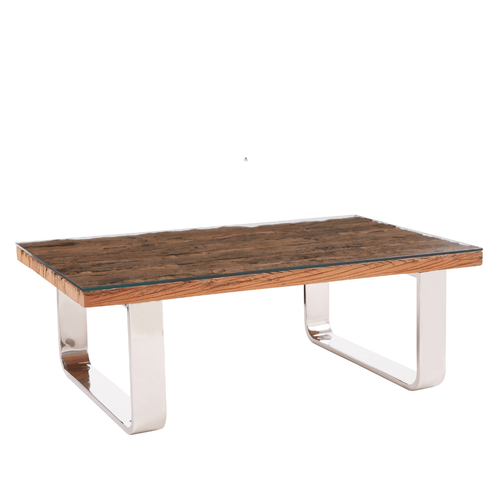 Modern minimalist coffee table with a wooden top under clear glass and sleek U-shaped metal legs—perfect for contemporary interiors.