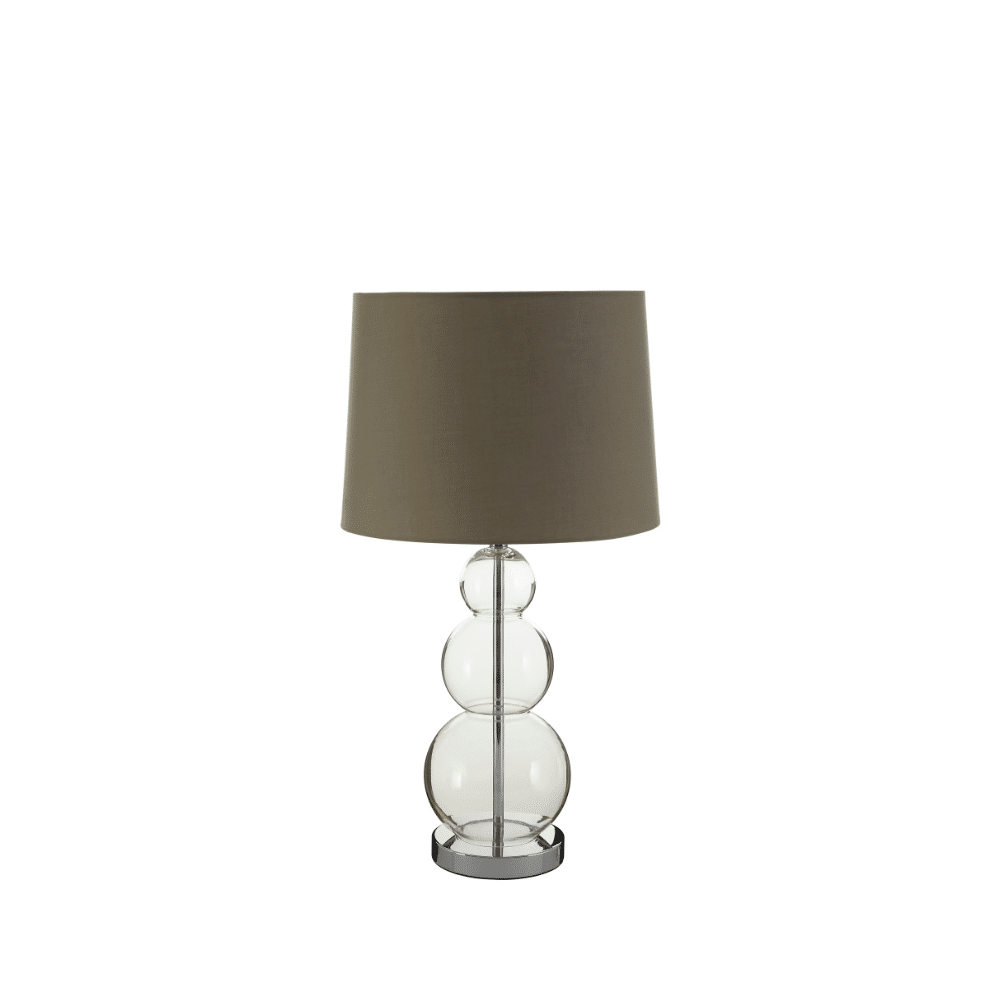 Elevate your interior with the modern charm of our ‘Orb Stack Lamp.’ This striking table lamp features a distinctive base crafted from three perfectly stacked, clear glass spheres, creating an eye-catching silhouette. Topped with a chic grey fabric drum shade, it provides a sophisticated contrast that complements a variety of contemporary and transitional decors. Ideal for adding a stylish accent and soft, ambient light to bedside tables, console tables, or living room side tables. The ‘Orb Stack Lamp’ is where unique design meets practical elegance.