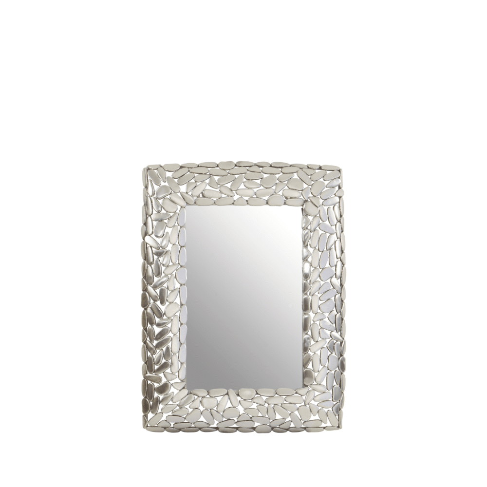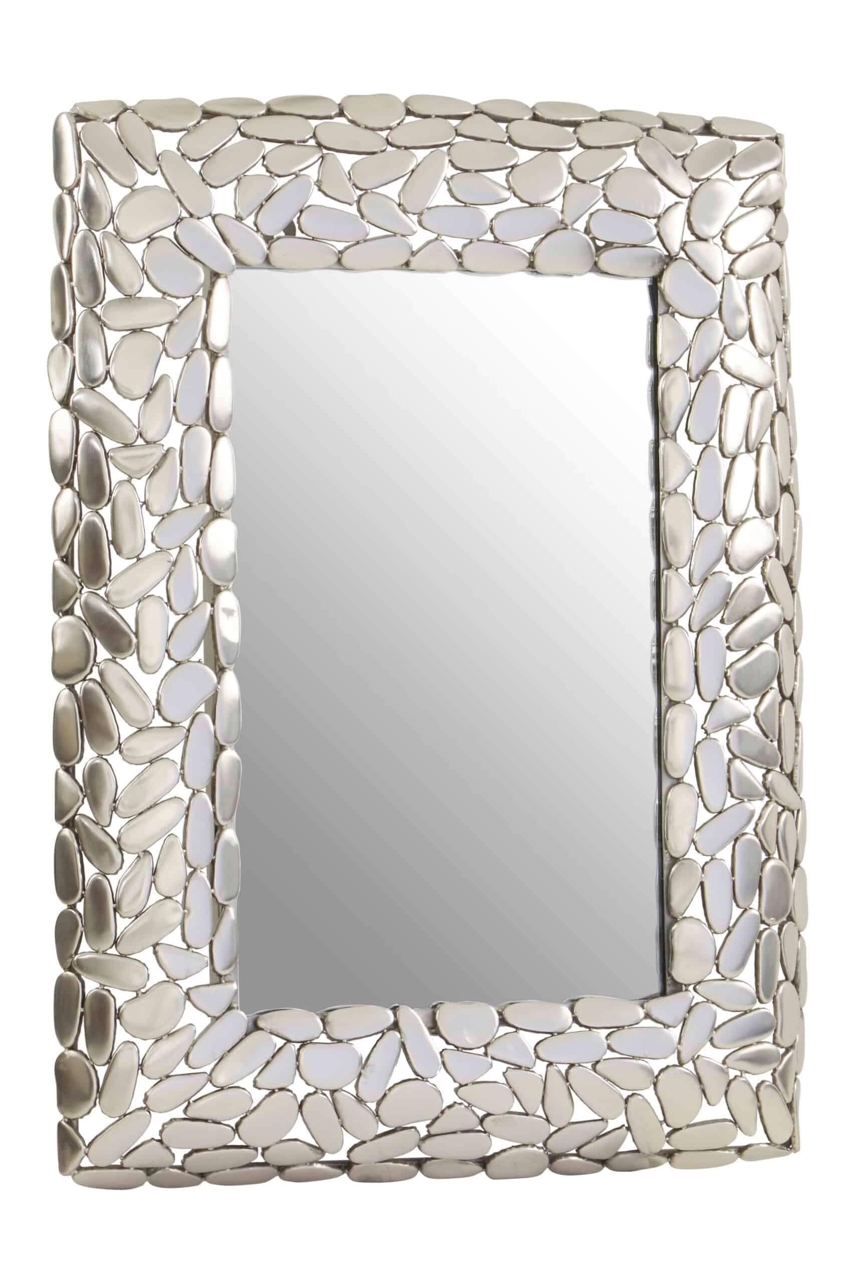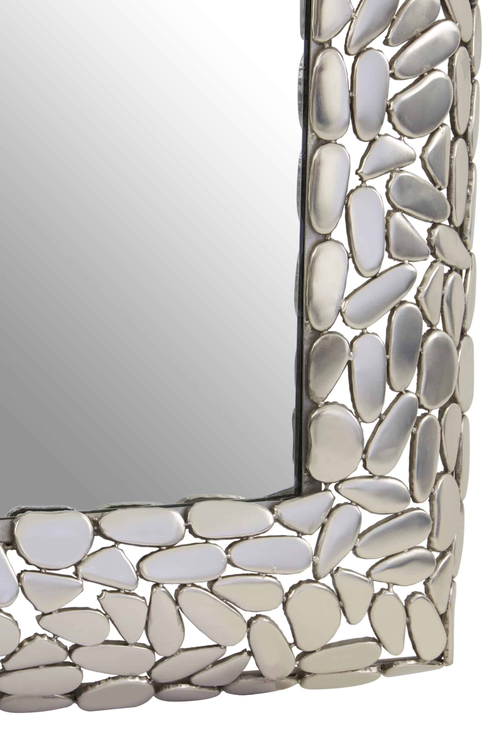 The Pebble Silver Rectangle wall mirror pairs a sleek pane with antique nickel iron pebbles for a textured, luxurious look.