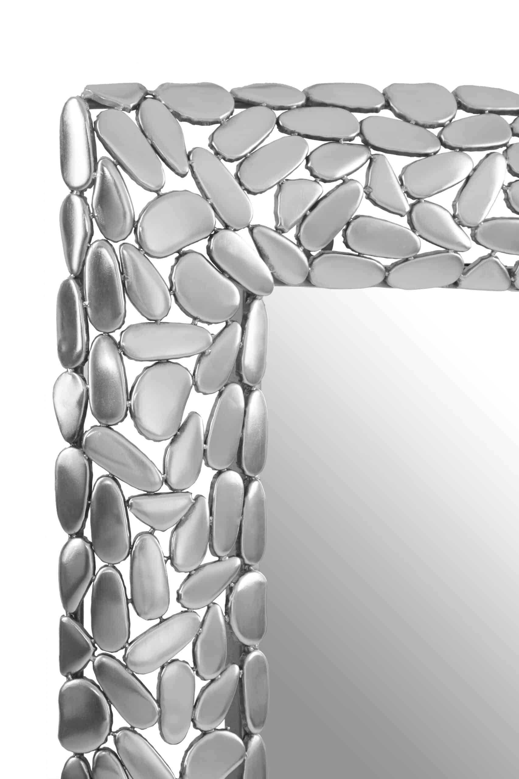 This Pebble Silver Rectangle wall mirror features a central reflective pane surrounded by individual iron pebbles with an antique nickel finish, adding a textured and luxurious touch.