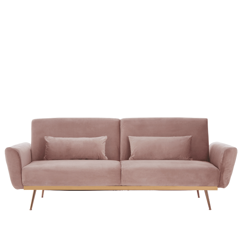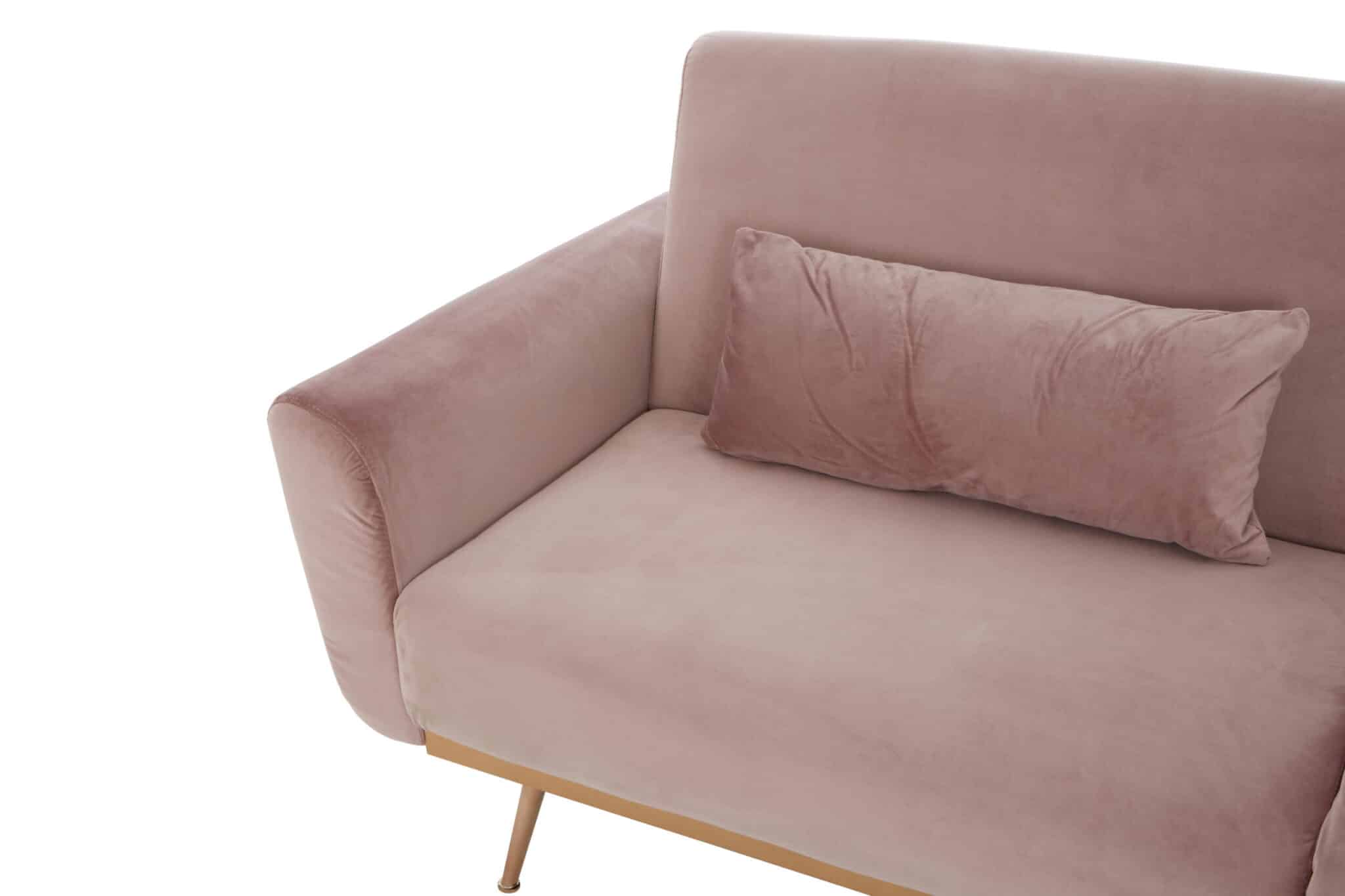 Experience the luxurious embrace of the Petal Velvet Dreamer sofa bed. Upholstered in soft and inviting pink velvet, this modern piece offers superior comfort with its ample foam padding and supportive wavy springs. Supported by a robust solid eucalyptus wood frame and accented with elegant gold electroplating hardware legs, this sofa bed provides a stylish and comfortable solution for both seating and overnight guests.