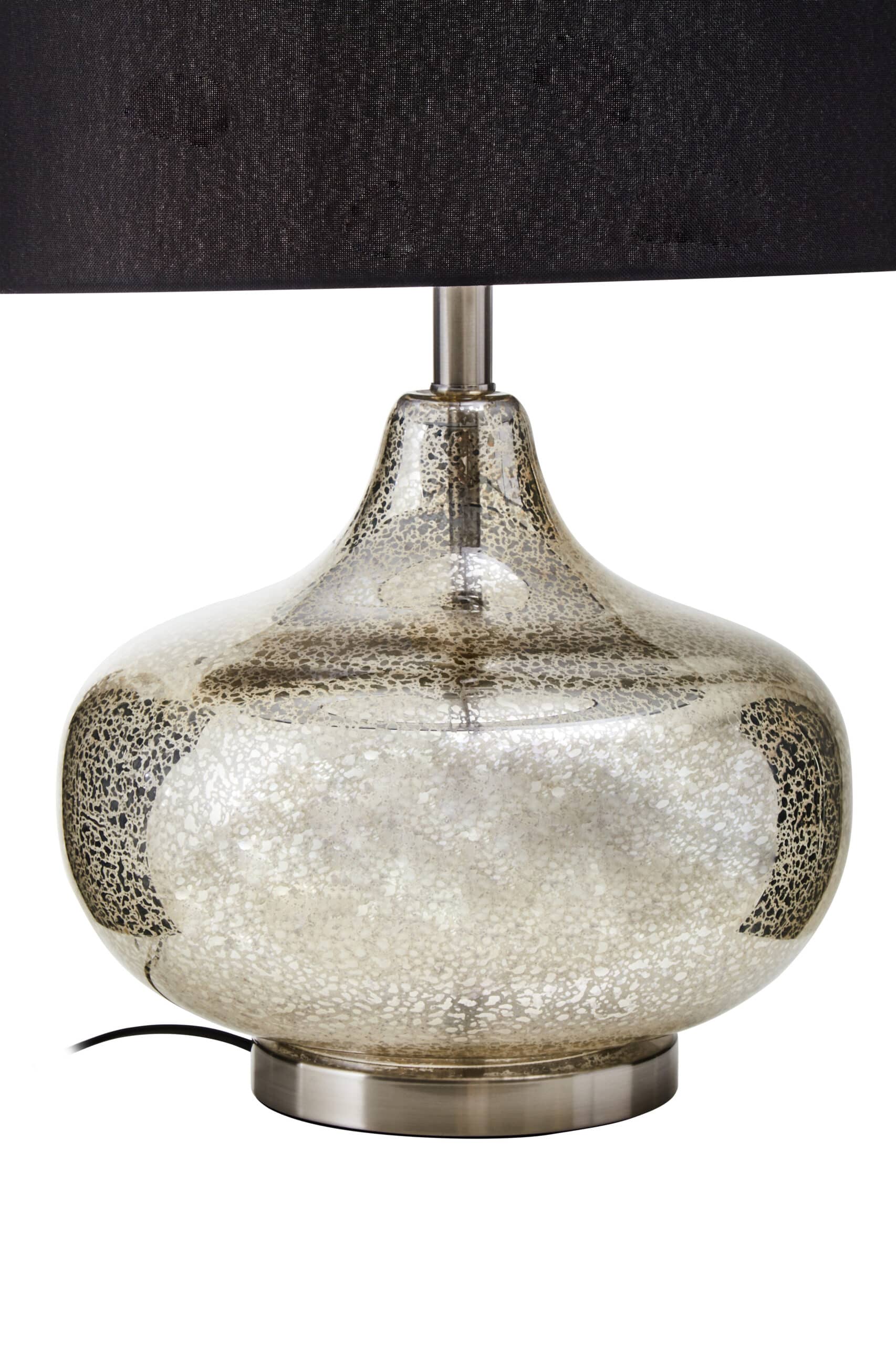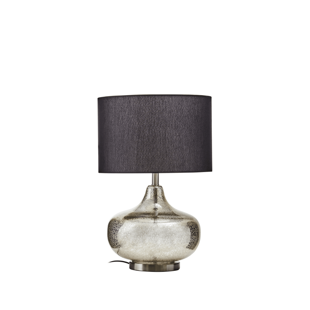 Bring a touch of unique elegance to your decor with our ‘Quicksilver Table Lamp.’ This contemporary piece features a captivating glass body with a distinctive mercury glass finish, creating a shimmering, reflective effect that catches every eye. Crowned with a sophisticated black linen drum shade, it offers a striking contrast and diffuses light beautifully. Supported by a sturdy metal base, this lamp is designed to complement a wide variety of interior styles, from modern minimalist to chic transitional.