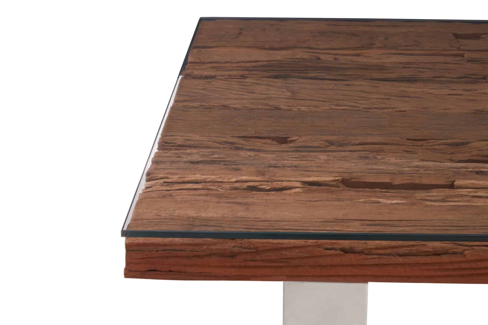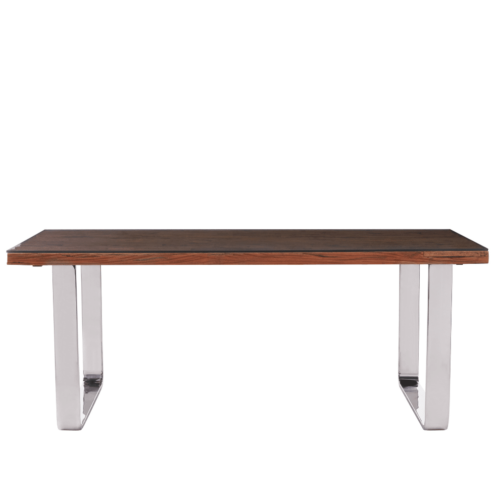 The Reclaimed Wood & Steel Dining Table is a testament to natural beauty and modern design. This expertly handcrafted dining table features a rectangular salvaged wood top, beautifully accented by a clear glass slab. Supported by a sleek U-shaped sled base made from silver-finish stainless steel, it offers a contemporary yet grounded aesthetic, perfect for any dining space.