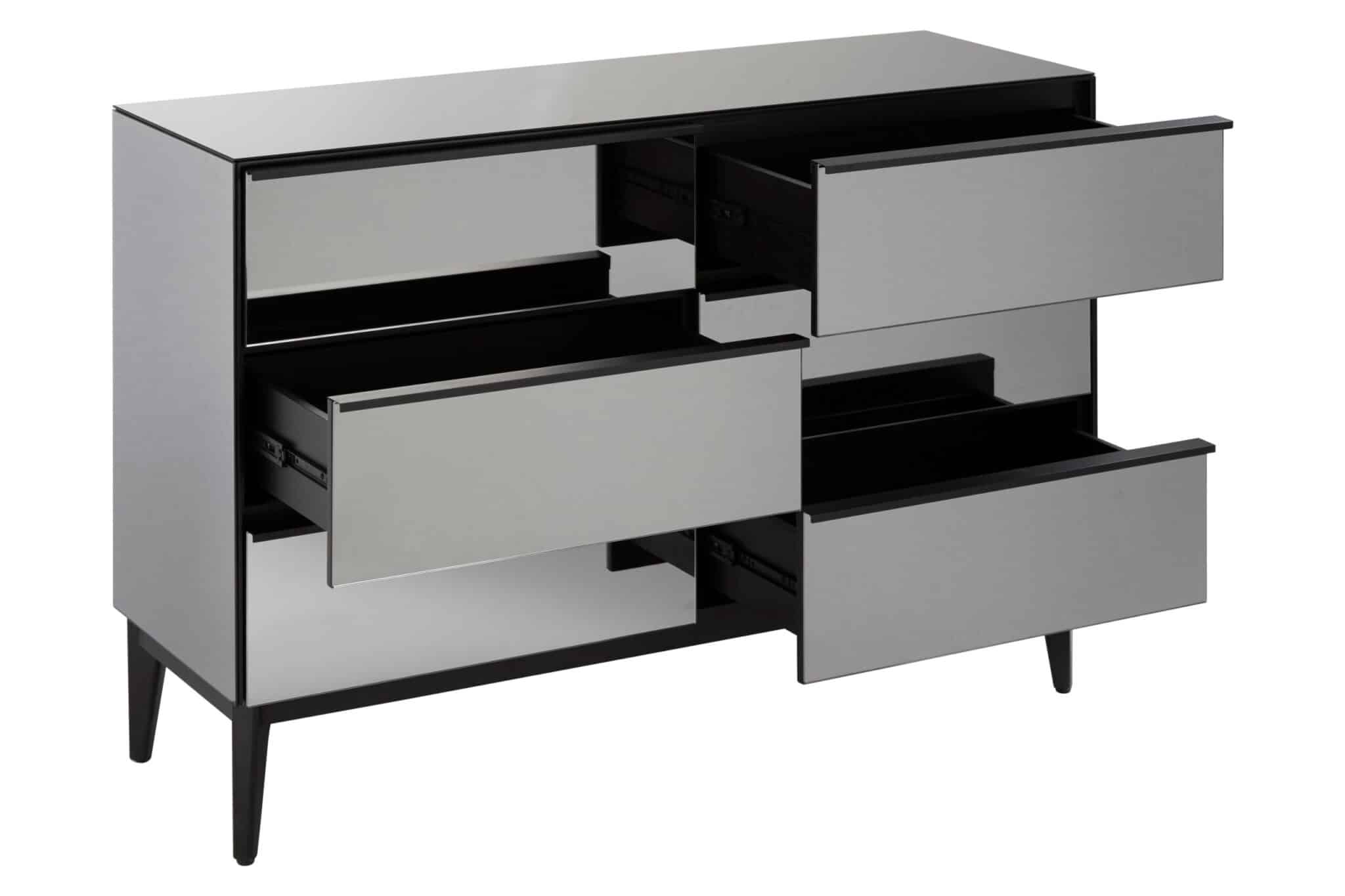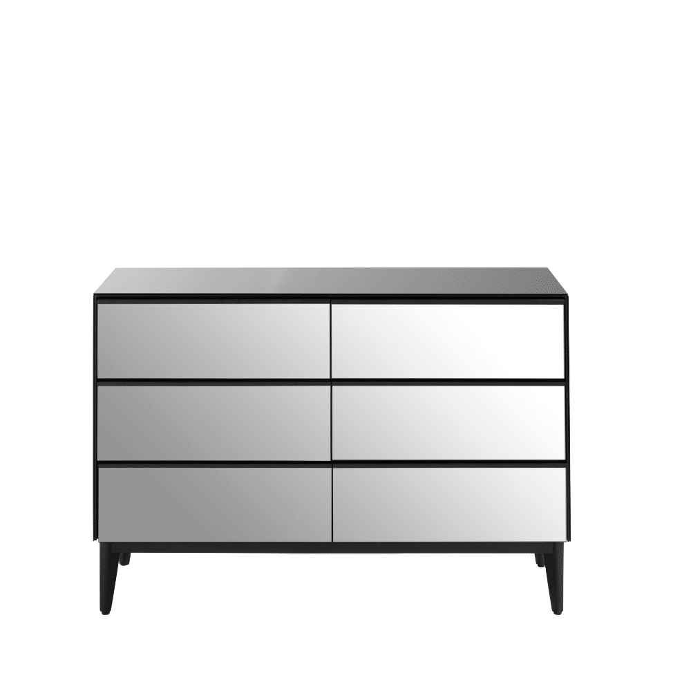 The Reflekt 6 Drawer Dresser offers a sleek and modern aesthetic, bringing a subtle reflective quality to your bedroom. Featuring six spacious drawers with elegant mirrored glass fronts, it provides ample storage while adding a touch of contemporary sophistication. Likely constructed with a sturdy MDF frame, this chest creates a visually comfortable and stylish atmosphere in your personal space.