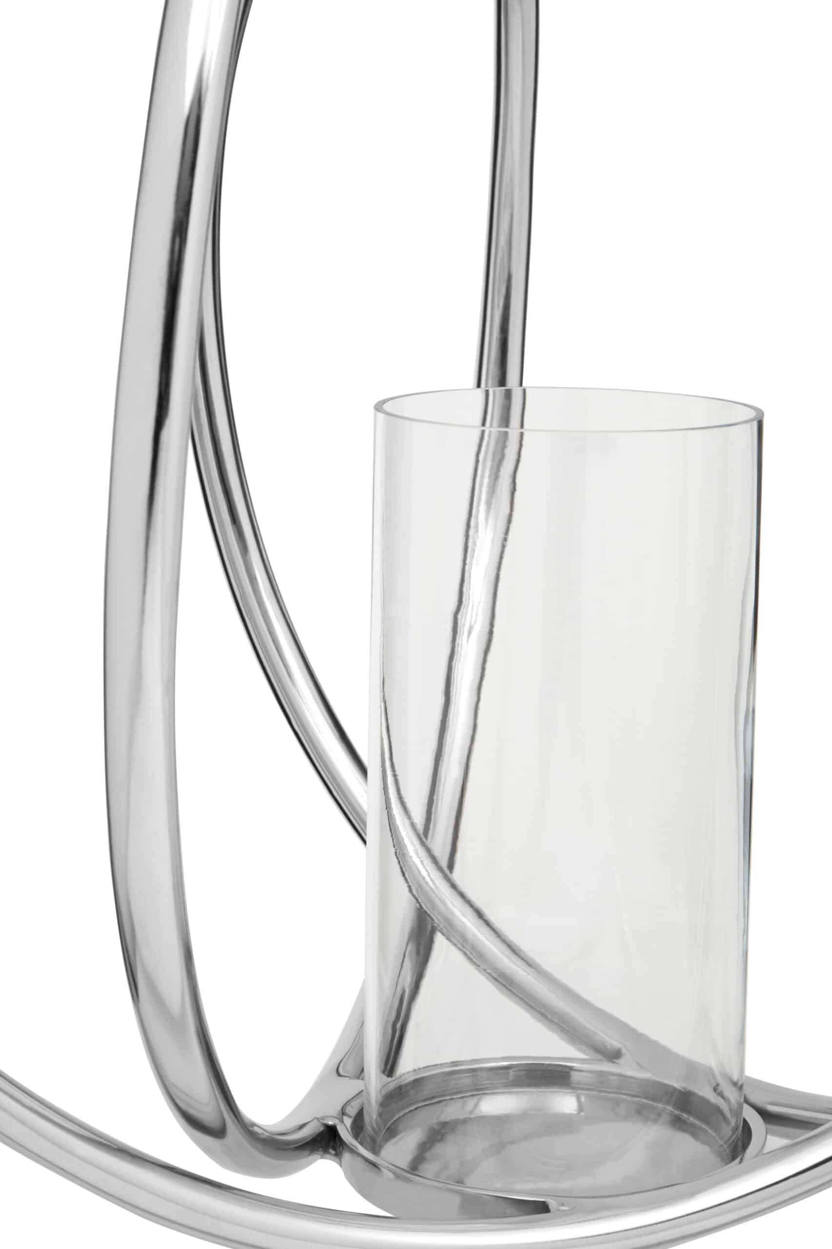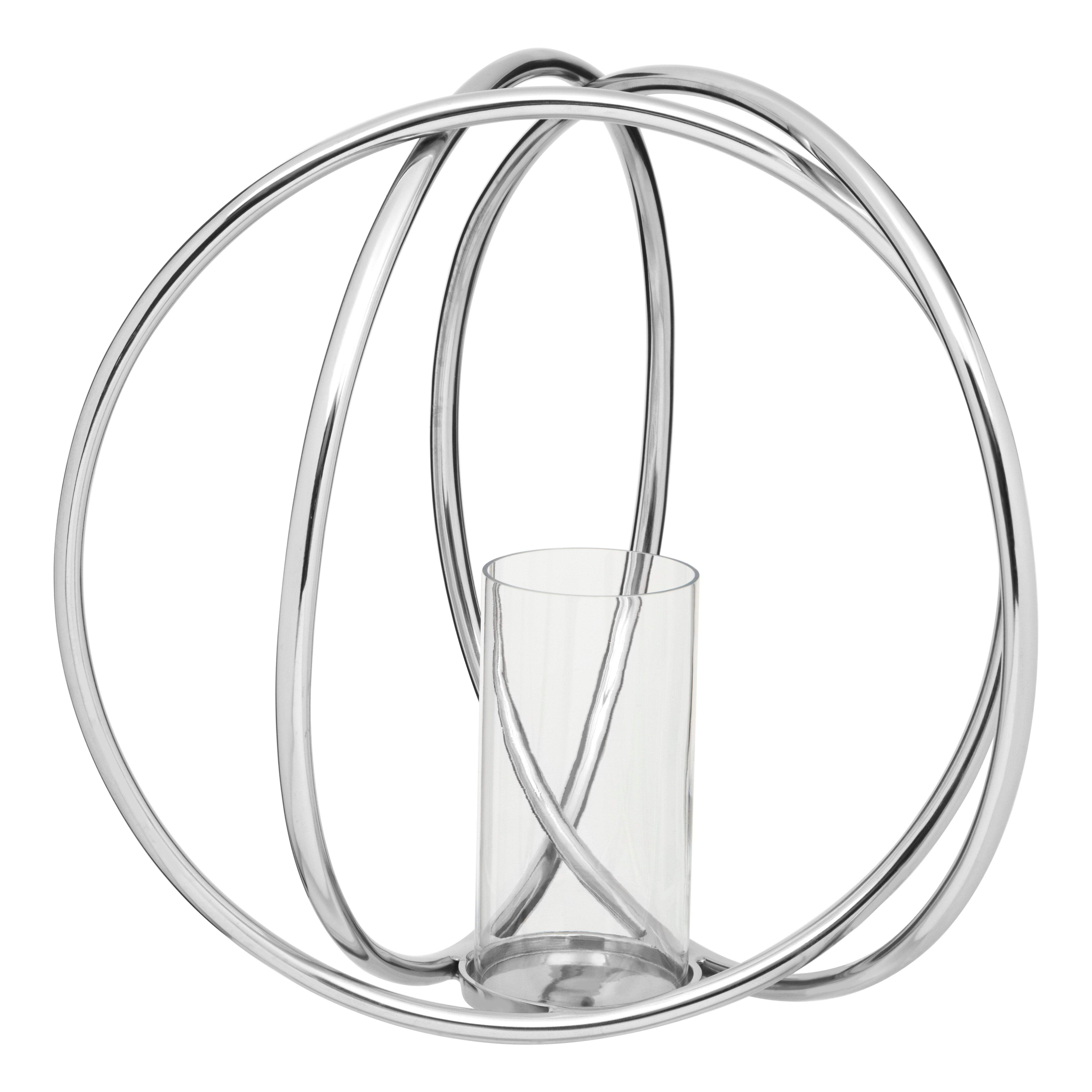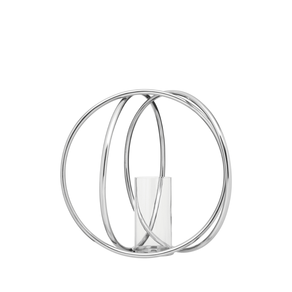 Enhance your décor with this large and distinctive silver candle holder. Its interlocking circular design and glass enclosure beautifully diffuse candlelight.