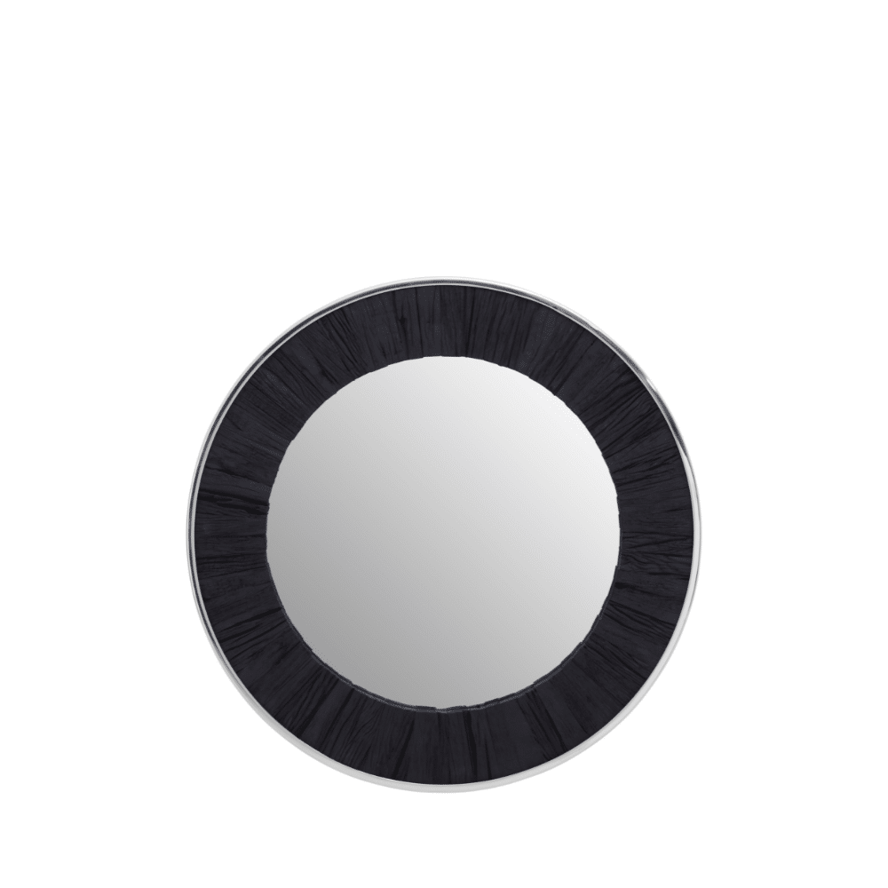 This round mirror features a black wood frame with a silver inner lining, offering sleek, contemporary elegance.