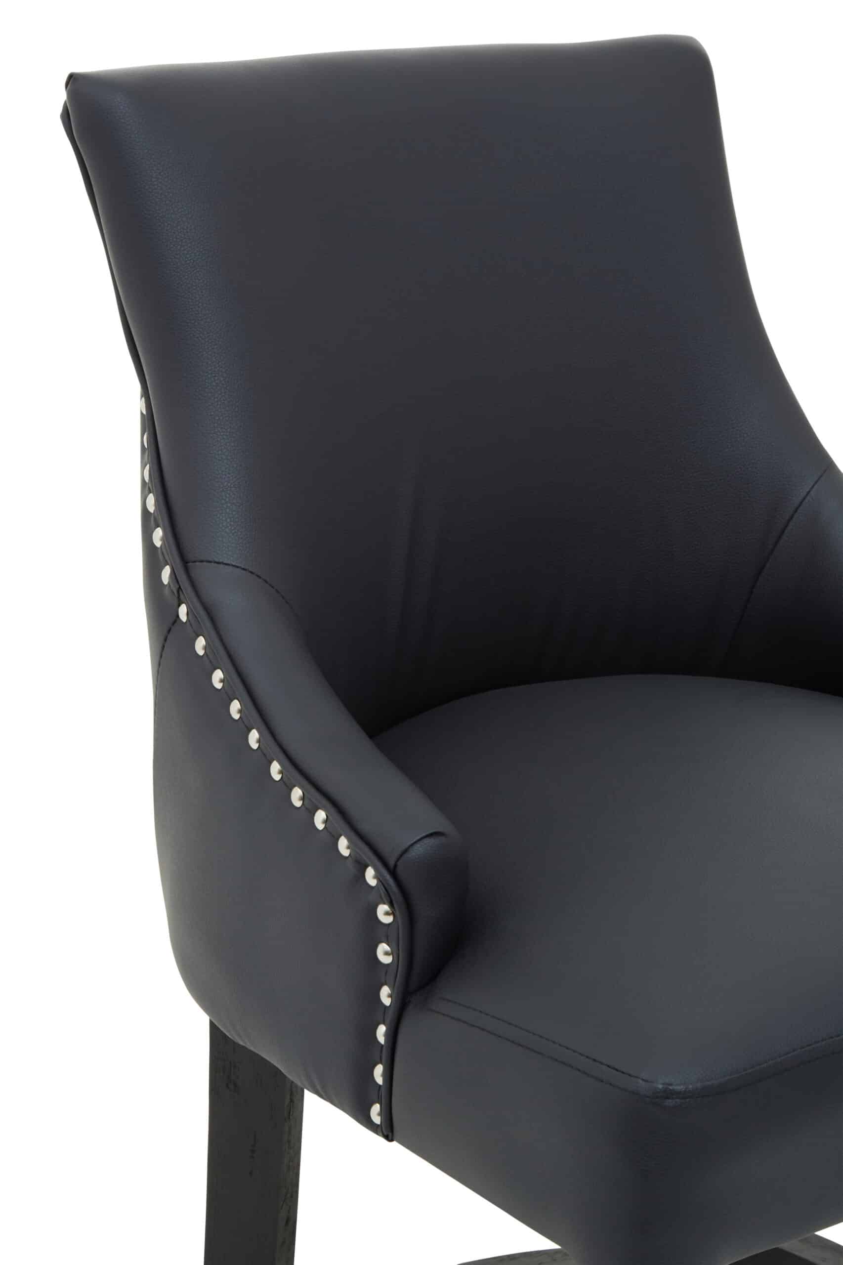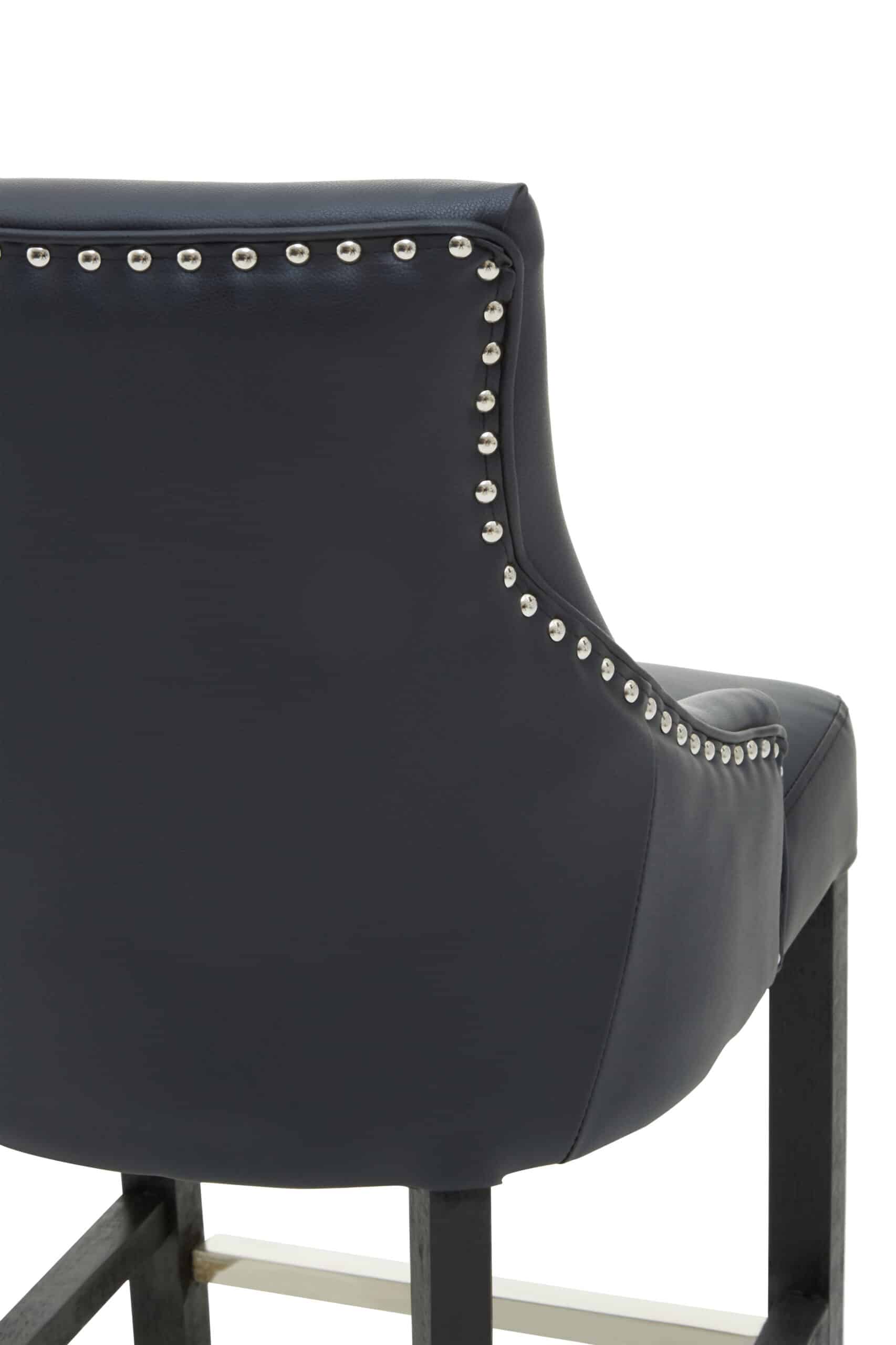 The Shadow Stud Barstool offers comfortable and contemporary seating for your bar area. Upholstered in sleek charcoal faux leather with elegant stud detailing, it provides a supportive and inviting seat. The sturdy solid wood legs in a black finish ensure stability, while subtle velvet accents add a touch of luxurious comfort.