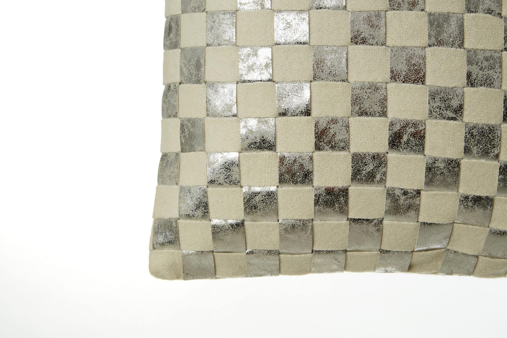 This square cushion features a chic check pattern in distressed ivory and silver, adding subtle sparkle to modern spaces.