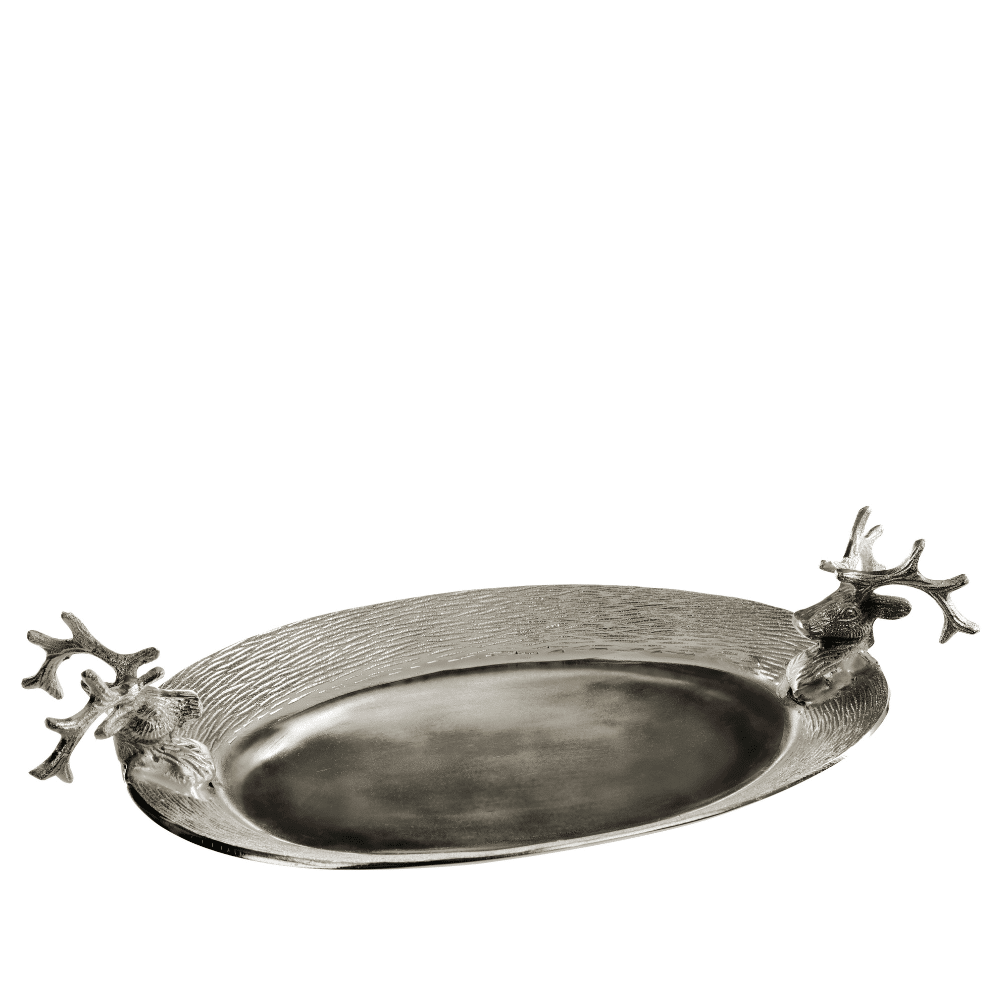 Make a statement with this tray—featuring sleek nickel and bold deer head handles for rustic flair.