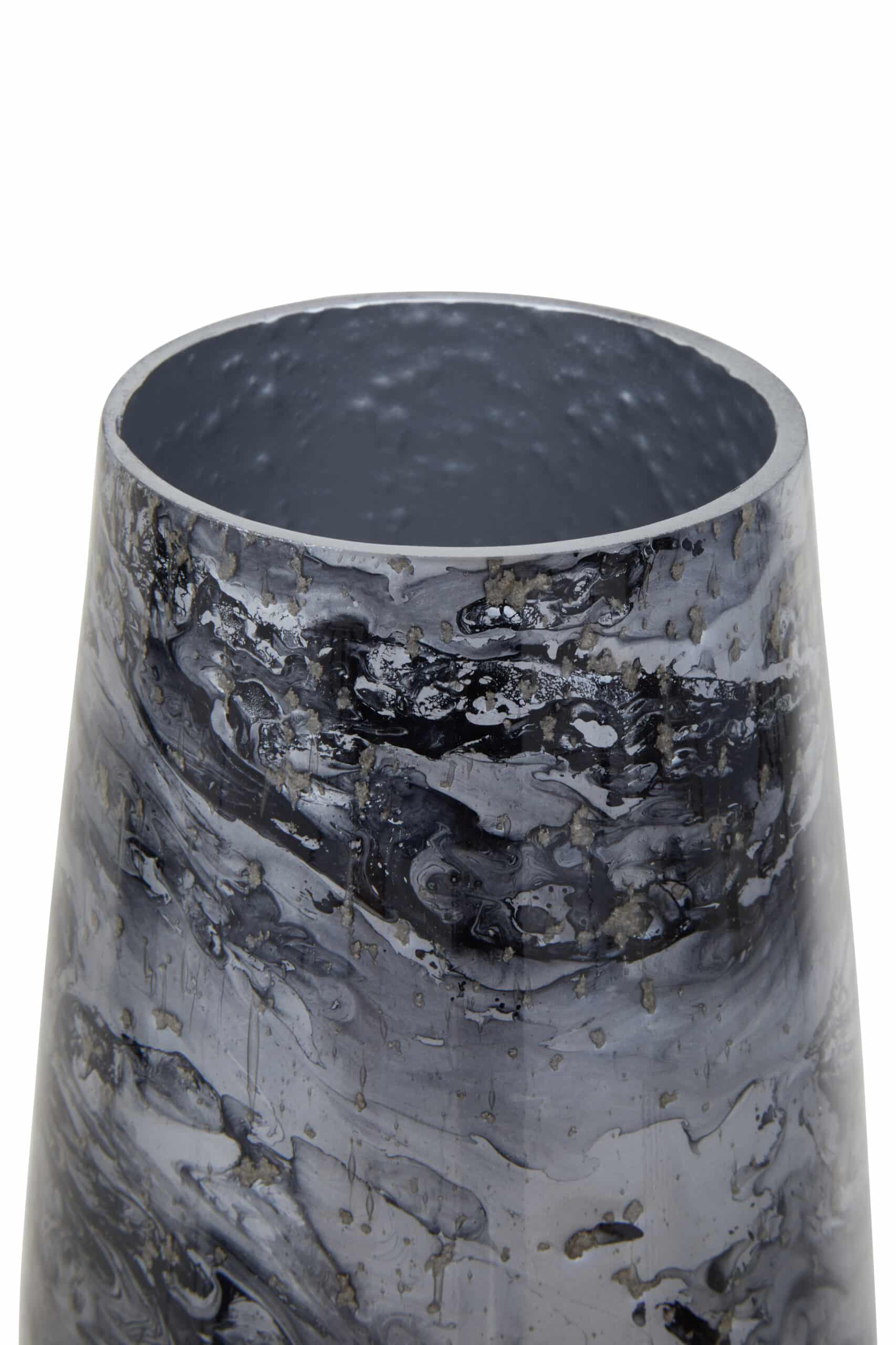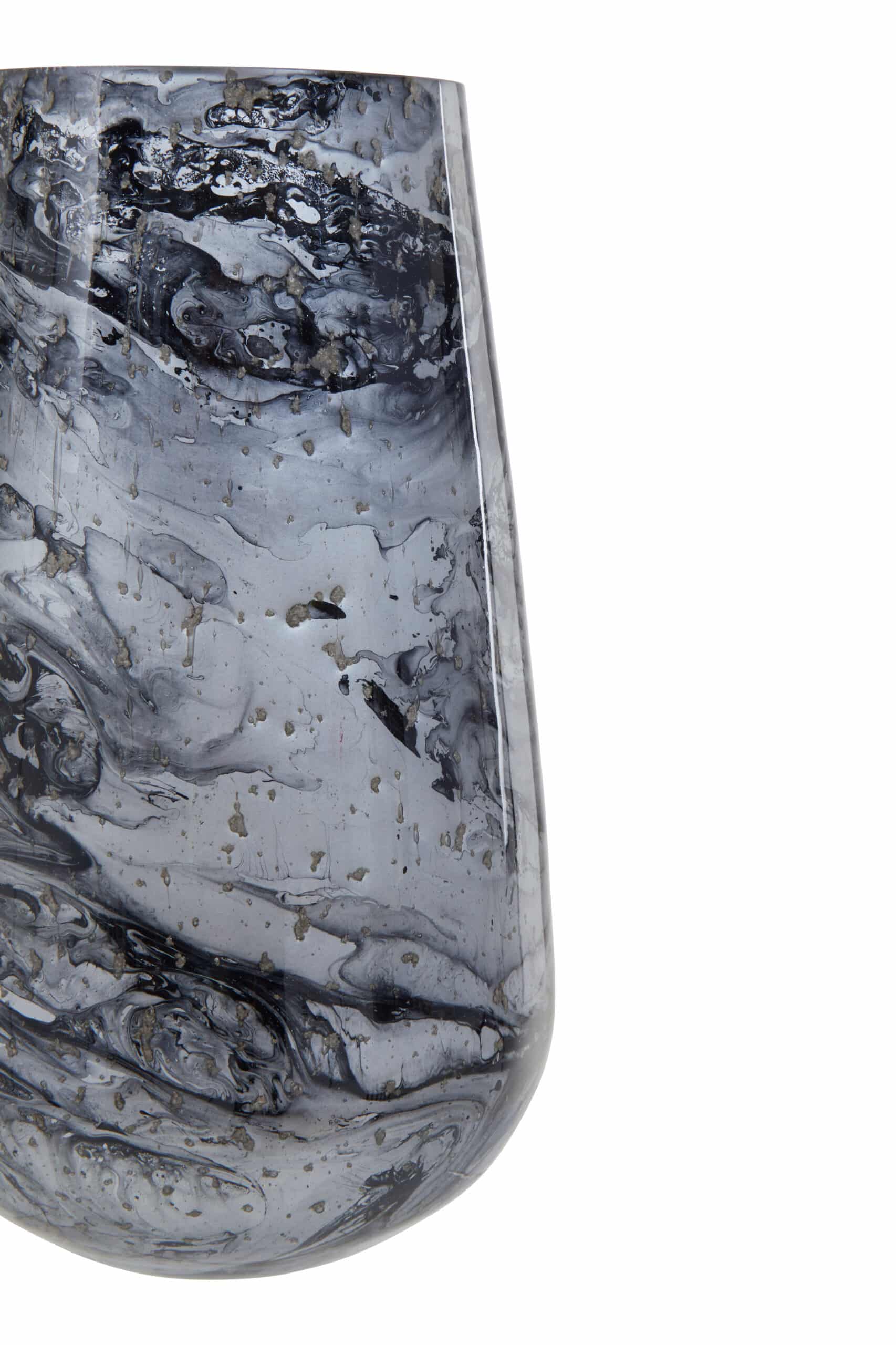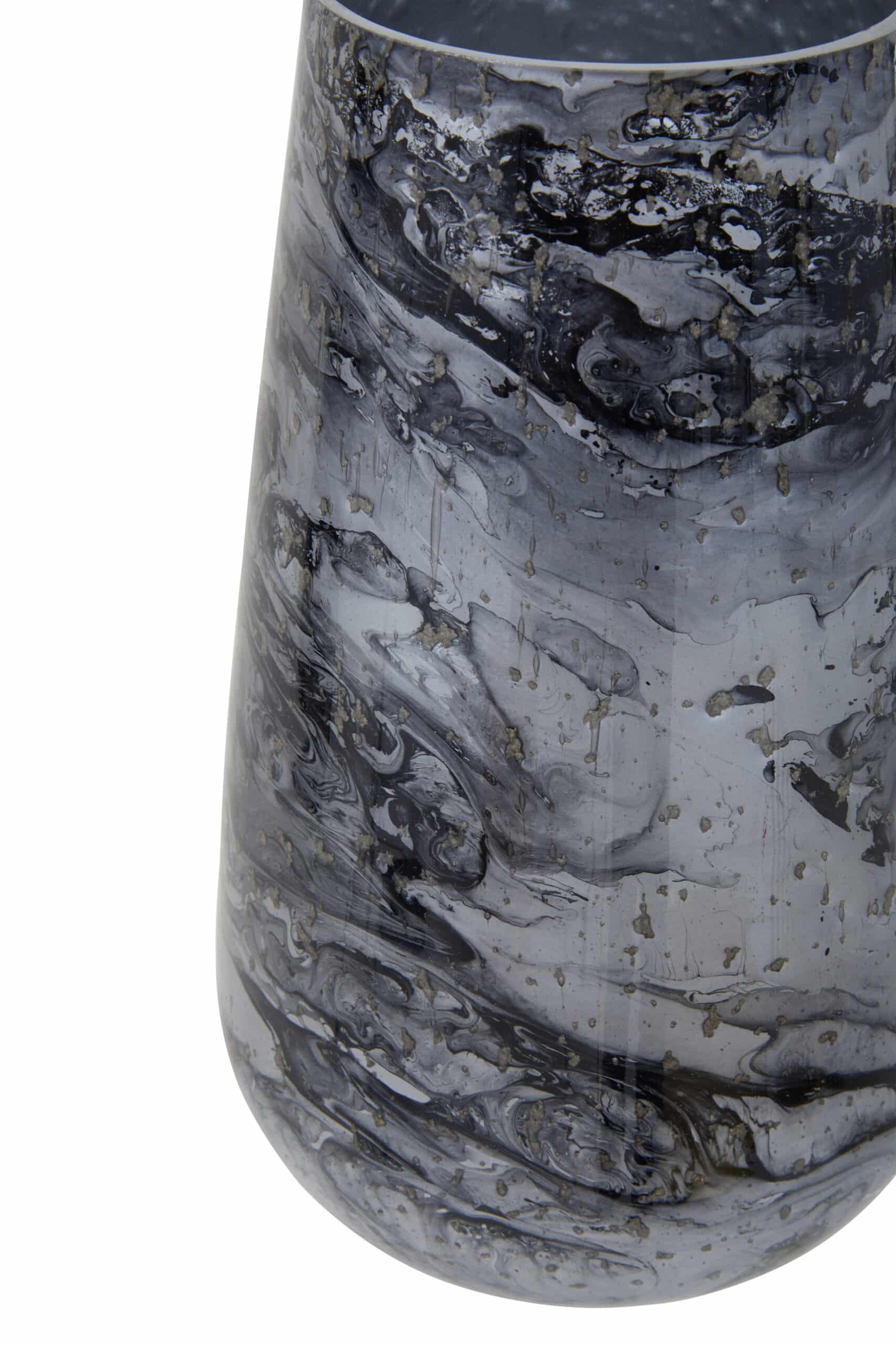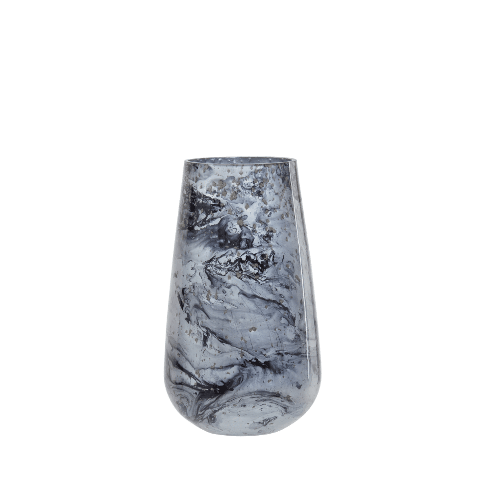The Marbled Whisper Vase presents a captivating grey marble effect across its smooth glass surface. Its sturdy base ensures stability, while the swirling patterns evoke the serene beauty of natural stone, bringing a touch of understated sophistication to any space.