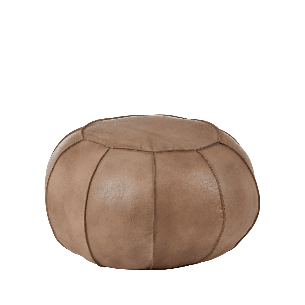 Chic and practical, this grey leather pouffe features elegant piped edges that define its soft, inviting structure. It’s a versatile piece for extra seating or a comfortable footrest.