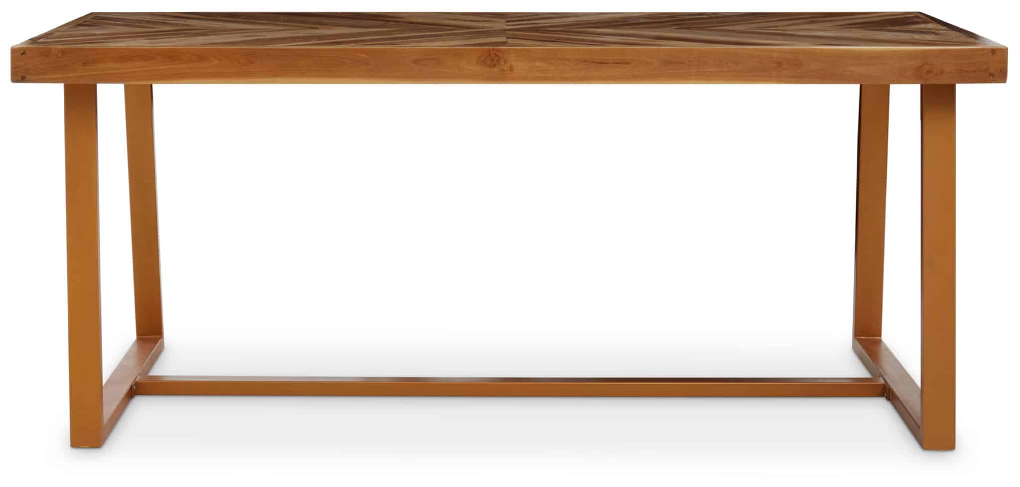The TeakFlow Dining Table features a clean, functional design that highlights the beauty of natural teak wood. Its spacious top provides a comfortable surface for meals, while the open-frame metal base offers sturdy support and ample legroom for relaxed dining.