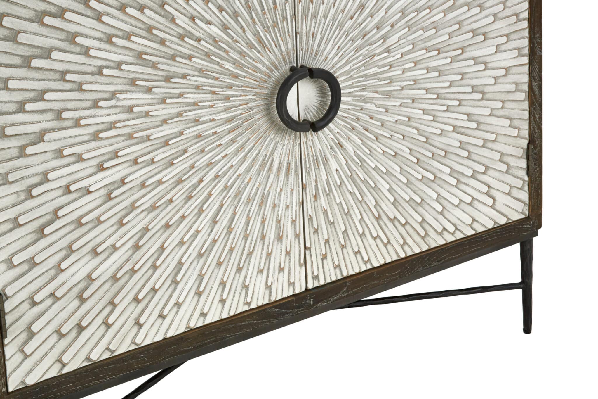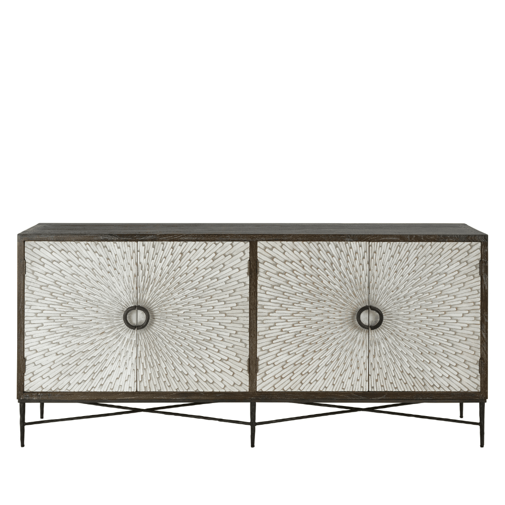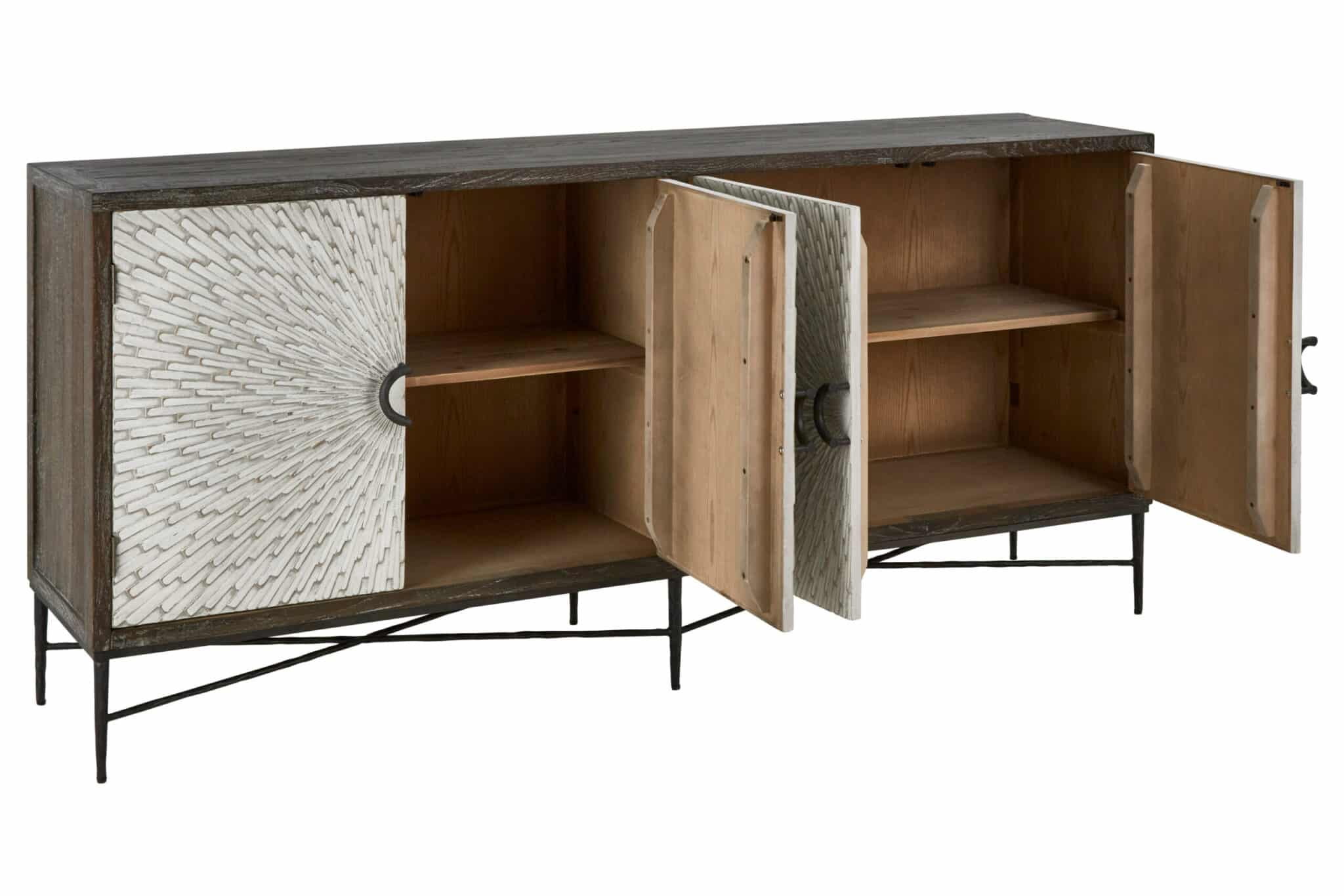 Introducing the TerraGrain Accent Cabinet, a modern sideboard built with the enduring quality of elm wood. The solid wood construction offers a sense of substance and warmth, while metallic details in iron add a contemporary touch. This sideboard provides generous storage and a visually comfortable, grounding presence in your home.