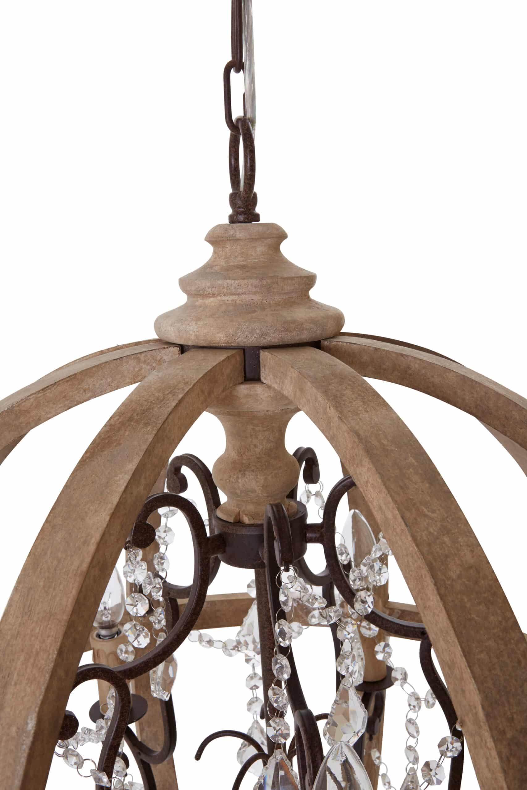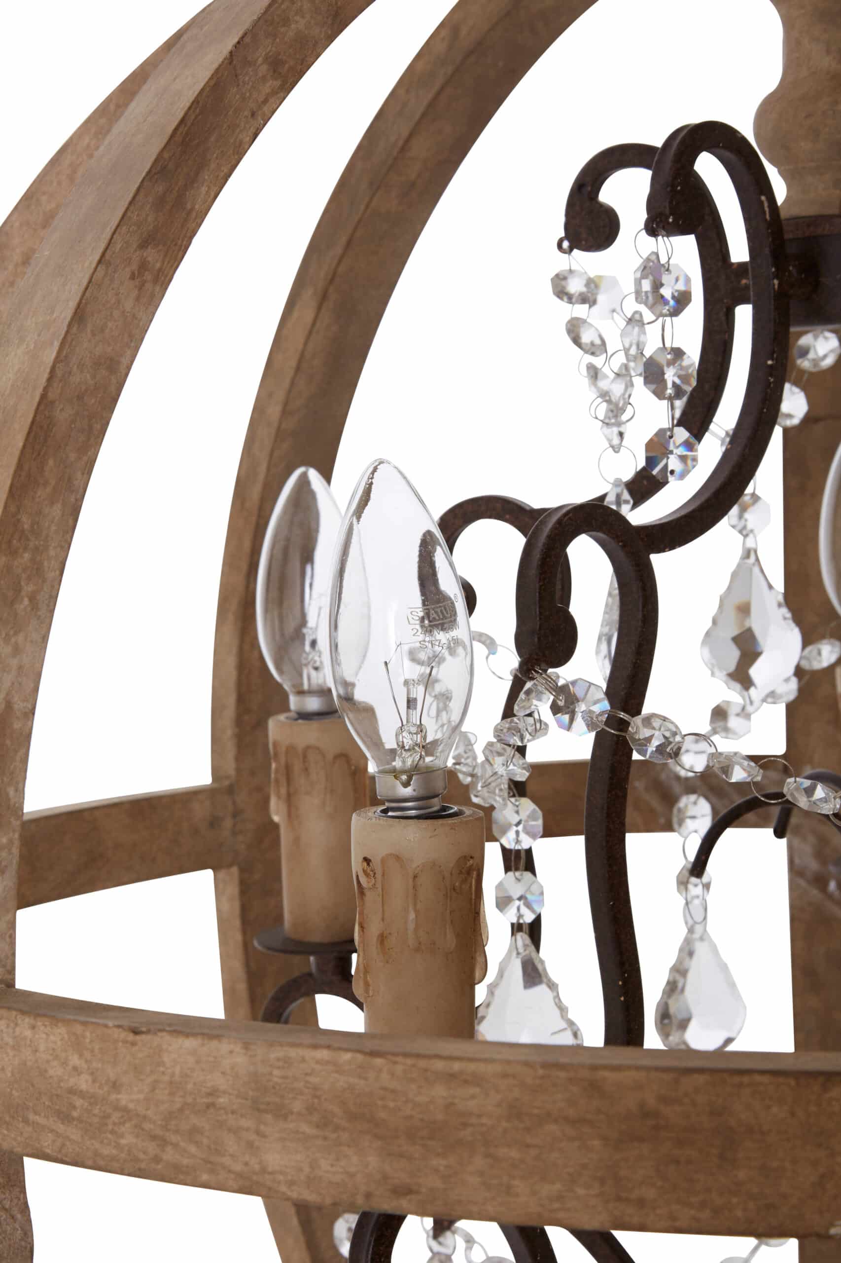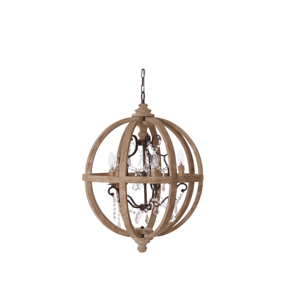 Introducing the ‘Timber Jewel Chandelier,’ a captivating blend of rustic charm and elegant sparkle. This exquisite 5-arm fixture is encased within a beautifully crafted circular wood frame, offering a warm, natural aesthetic. Delicate ‘jewels’ (crystals) gracefully drape from its arms, adding a touch of sophisticated shimmer and decorative flair that catches the light. Perfect for adding a focal point to dining rooms, cozy living areas, or entryways, this chandelier delivers both inviting illumination and undeniable character. Elevate your space with its unique blend of natural texture and subtle glamour.”