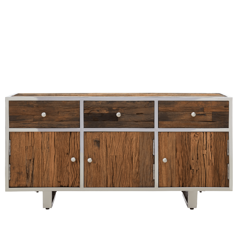 The Trinity Streamline Console offers a balanced and modern aesthetic. Featuring natural pinewood with a timeless appeal, accented by sleek stainless steel edges for a streamlined look. The inclusion of glass elements adds a touch of contemporary sophistication. This sideboard provides ample storage while seamlessly integrating into a comfortable and stylish living space.
