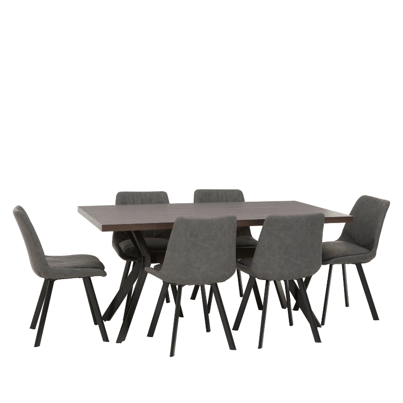 The UrbanSoft Dining Collection offers modern style without compromising on comfort. The rectangular tabletop, likely a durable brown MDF, provides a spacious dining area. The accompanying chairs are designed for comfort with supportive foam and a soft grey microfibre or resilient poly blend upholstery, ensuring a pleasant dining experience. The sleek iron legs complete this stylish and comfortable 7-piece dining set.
