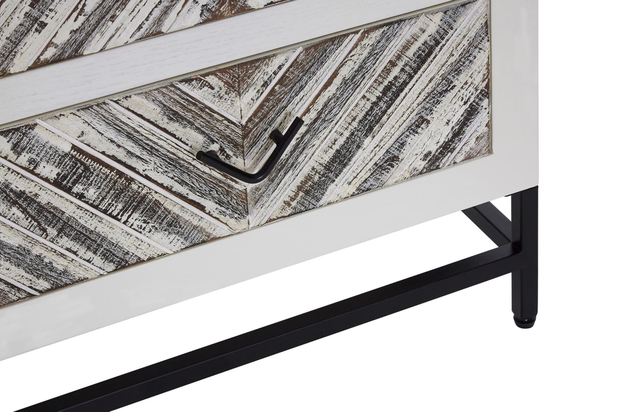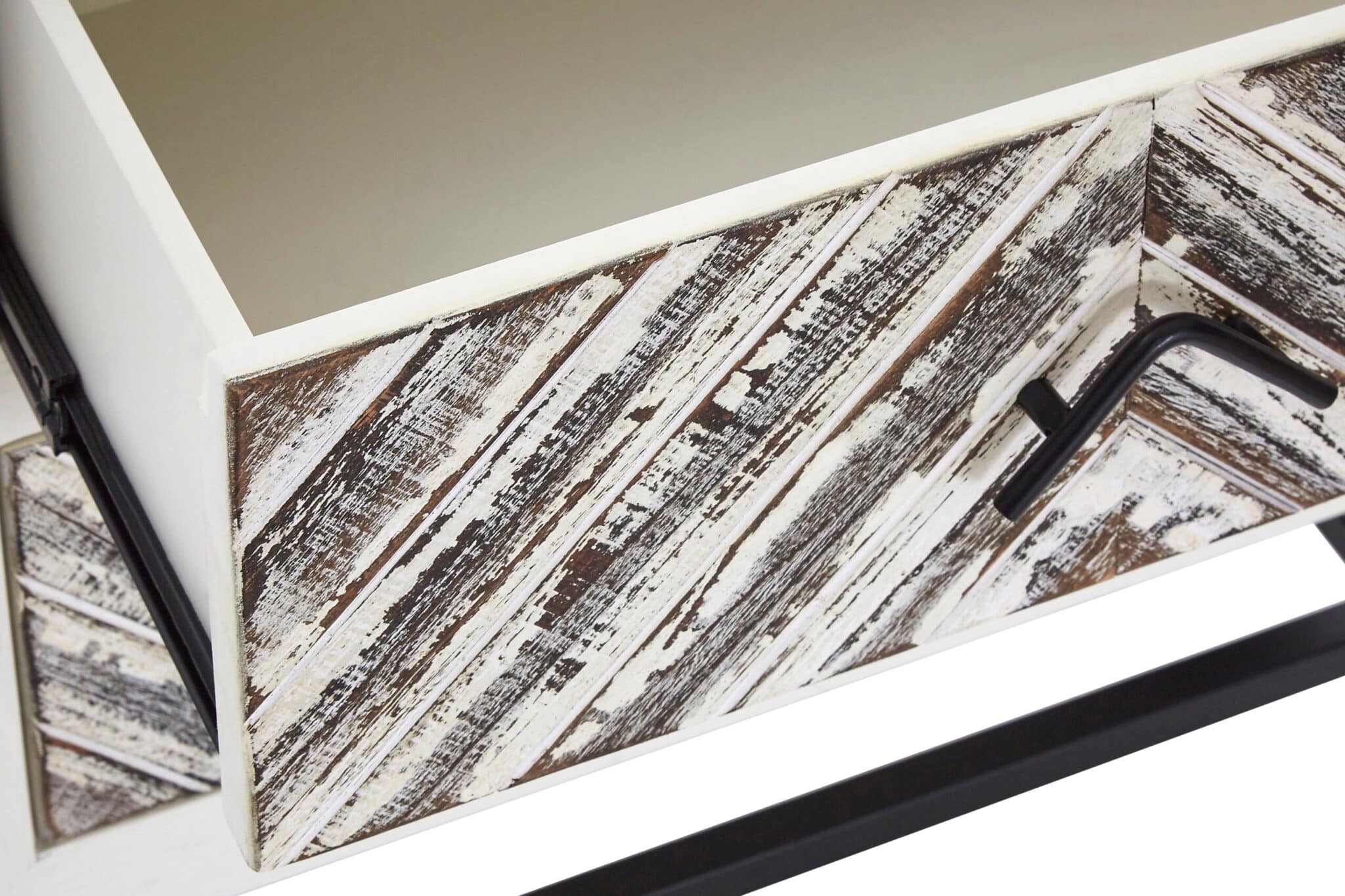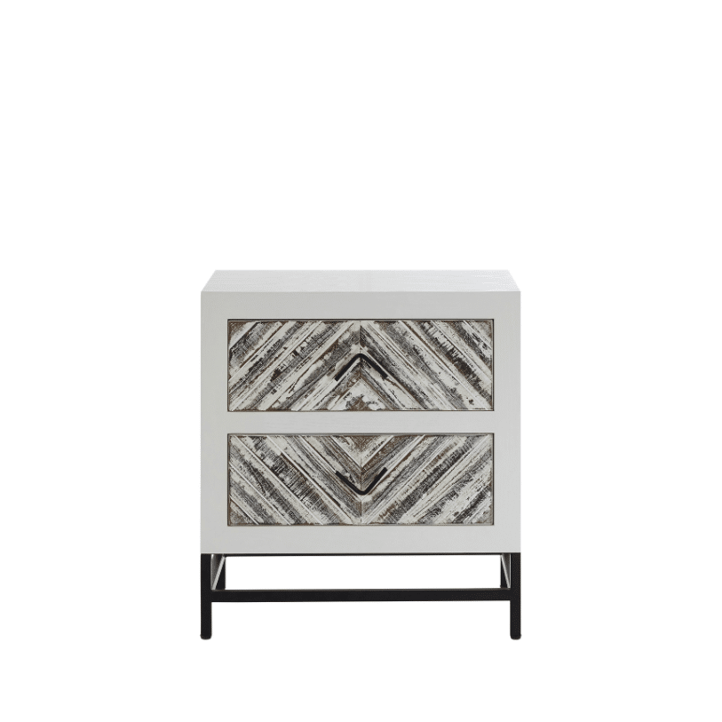 The Zephyr Boho Nightstand offers a modern and stylish accent for your bedroom. Featuring a clean white MDF frame and two drawers with a unique monochromatic boho-inspired veneer (ash tree over likely MDF), it provides convenient storage. A sleek iron frame and handle add a touch of contemporary comfort and visual appeal, complemented by subtle fir wood accents.